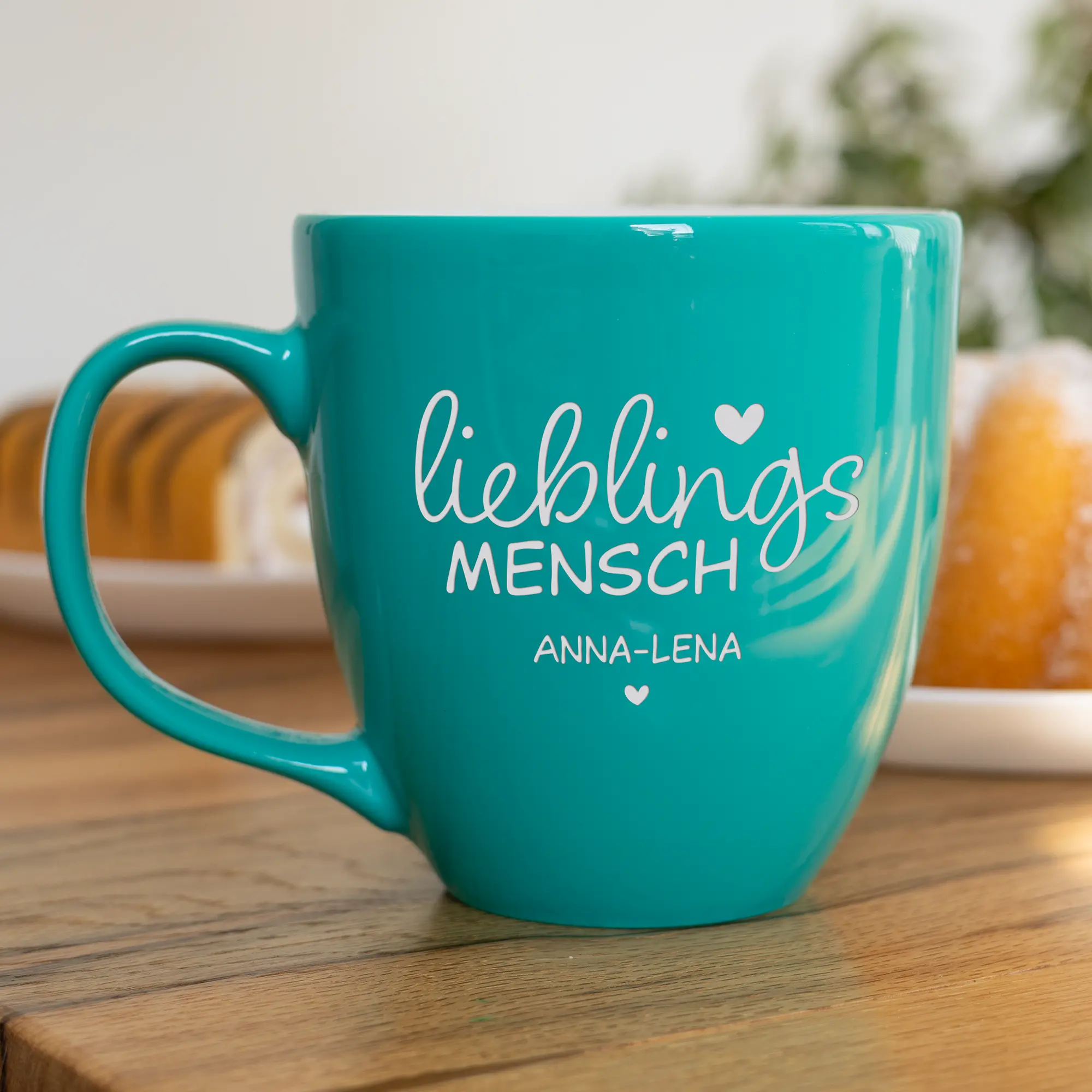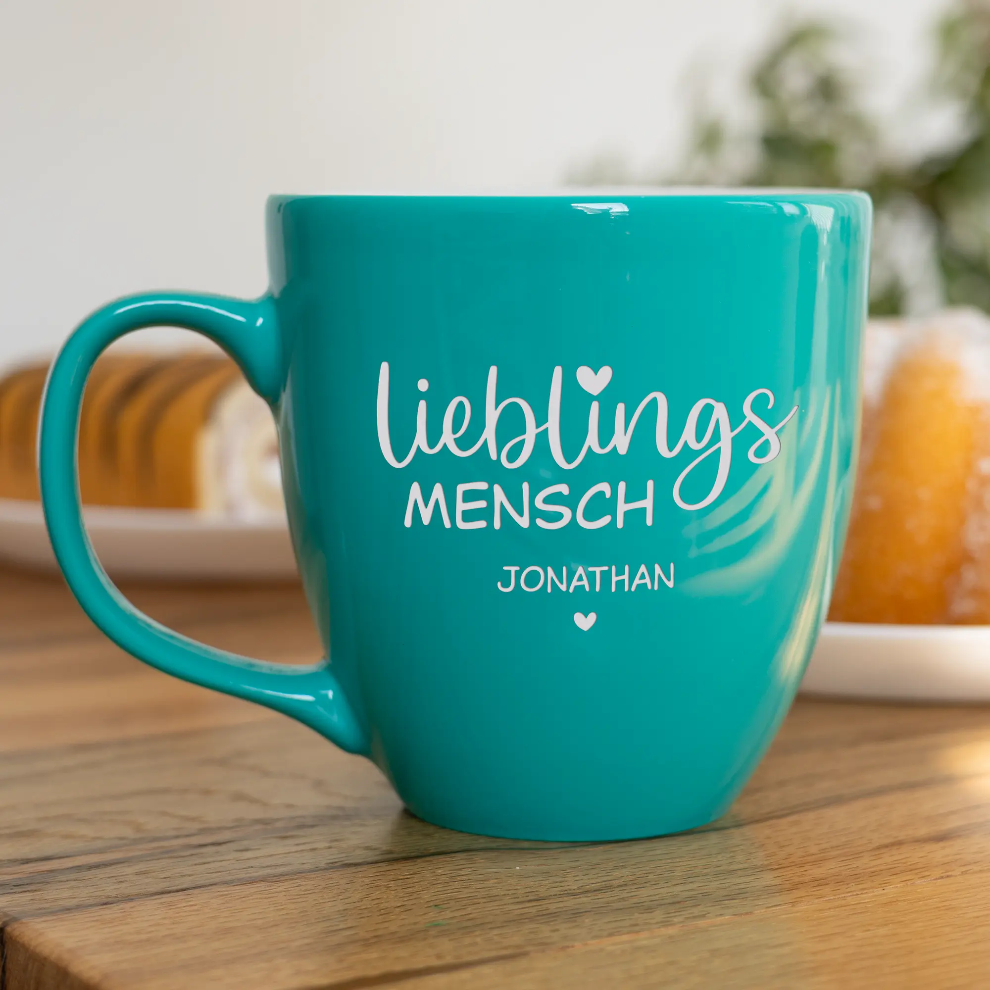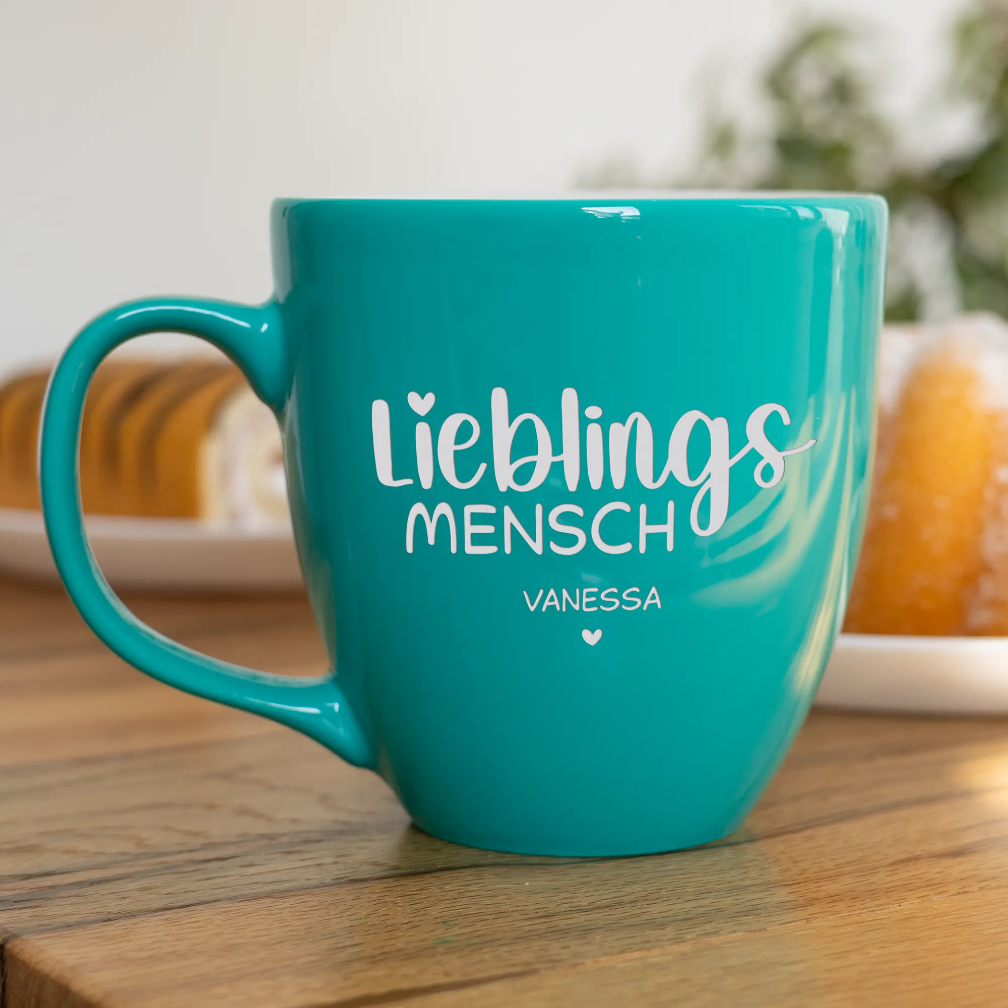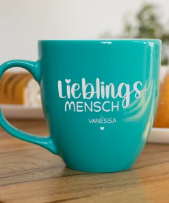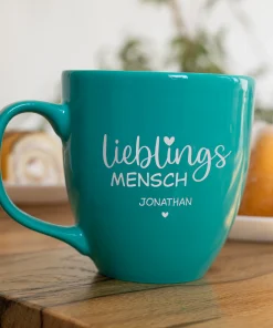 Die passende Geste für eure Lieblingsmenschen. Mit unserer personalisierten Tasse „Lieblingsmensch“ aus hochwertigem Porzellan habt ihr das optimale Geschenk für die besonderen Menschen in eurem Leben. Sei es euer Partner oder eure Partnerin, der beste Freunde oder die beste Freundin, der Arbeitskollege oder die Arbeitskollegin oder ein anderer besonderer Mensch. Die personalisierte Tasse mit einer Füllmenge von bis zu 400 ml erhaltet ihr bei uns in einer Vielzahl an Farben, sodass ihr auch die passende Lieblingsfarbe für euren Lieblingsmenschen wählen könnt. Des Weiteren könnt ihr unter dem filigranen Design des Wortes „Lieblingsmensch“ auch eure Wunschnamen bzw. den Namen der beschenkten Person eingravieren lassen, welche das Design abrundet und zusammen mit der von euch gewählten Farbe die Tasse noch einmal individueller gestaltet. Somit könnt ihr euren liebsten eine ganz persönliche Freude machen und Ihnen die Morgen- oder auch Abendstunden oder auch die Arbeitszeit bei Kaffee, Tee oder einem anderen warmen Getränk verschönern. Zeigt euren Lieblingsmenschen wie gerne ihr sie habt mit einer hochwertigen Tasse aus Porzellan in ihrer Lieblingsfarbe und einer kleinen aber doch bedeutungsvollen Gravur.