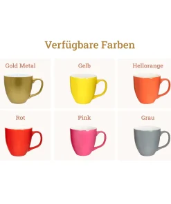 Bei der Gestaltung eurer Tasse aus Porzellan habt die Auswahlmöglichkeit aus den Farben Gold Metallic, Gelb, Orange, Rot, Pink, Grau, Grün, Violet, Türkis sowie den beiden Blautönen Hell- und Dunkelblau. Des Weiteren könnt ihr zwischen 16 verschiedenen Schriftarten wählen. Somit könnt ihr nicht nur für euch sondern auch für eure Freunde oder Familienmitglieder diese Tasse in deren Lieblingsfarbe holen, wodurch es auch zu einem tollen Geschenk für Geburtstage oder andere passende Feiertage wird. Macht euch und anderen eine besondere Freude mit dieser schönen und großen Tasse – Egal ob Kaffee, Tee, Kakao oder andere besondere Getränke!