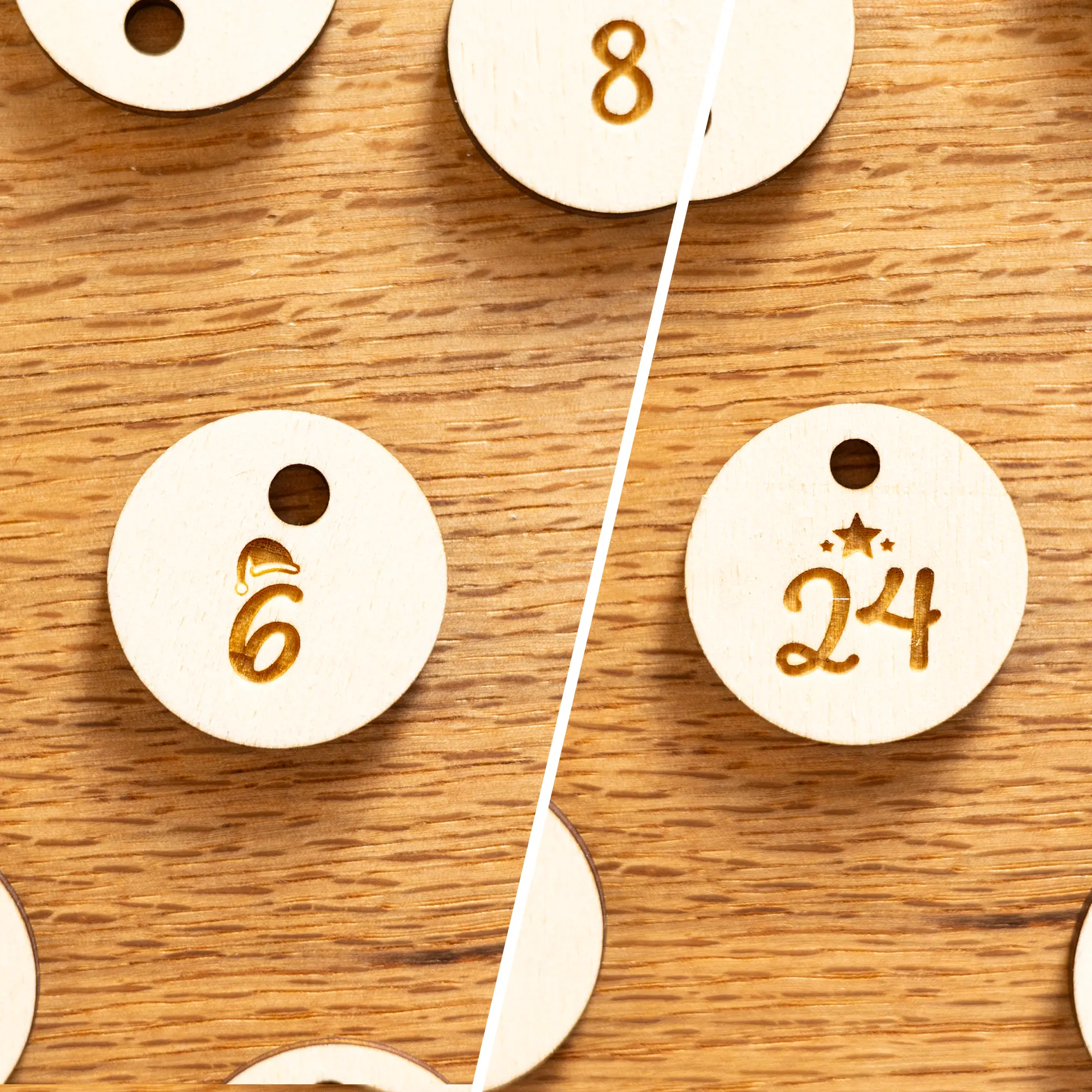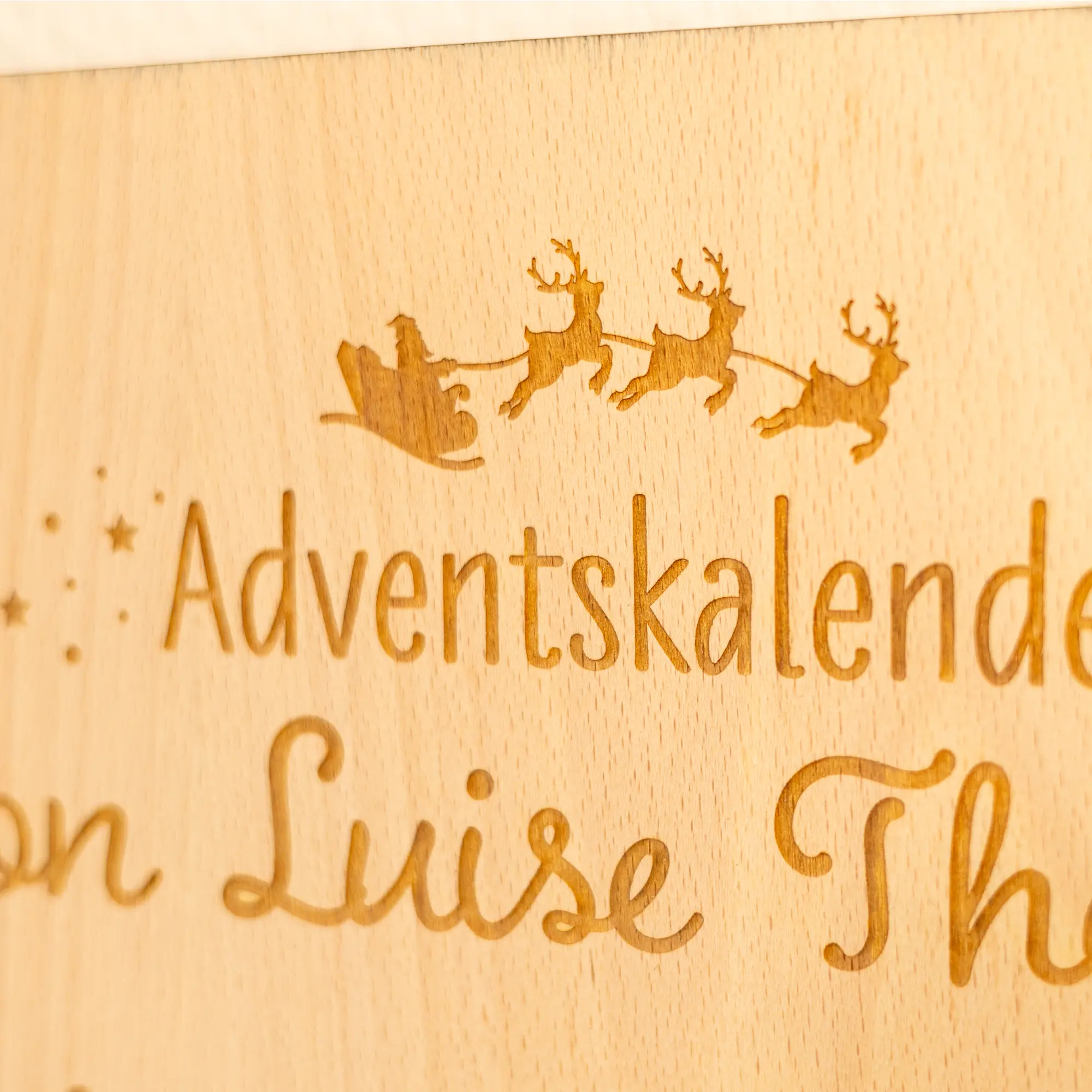 Den Adventskalender gibt es mit 2 leicht variierenden Motiven sowie wahlweise aus den robusten und nachhaltigen Materialien Birke oder Buche. Das Motiv wird mit präziser Lasertechnik eingraviert und der Kalender mittels Laserschnitt präzise ausgeschnitten.