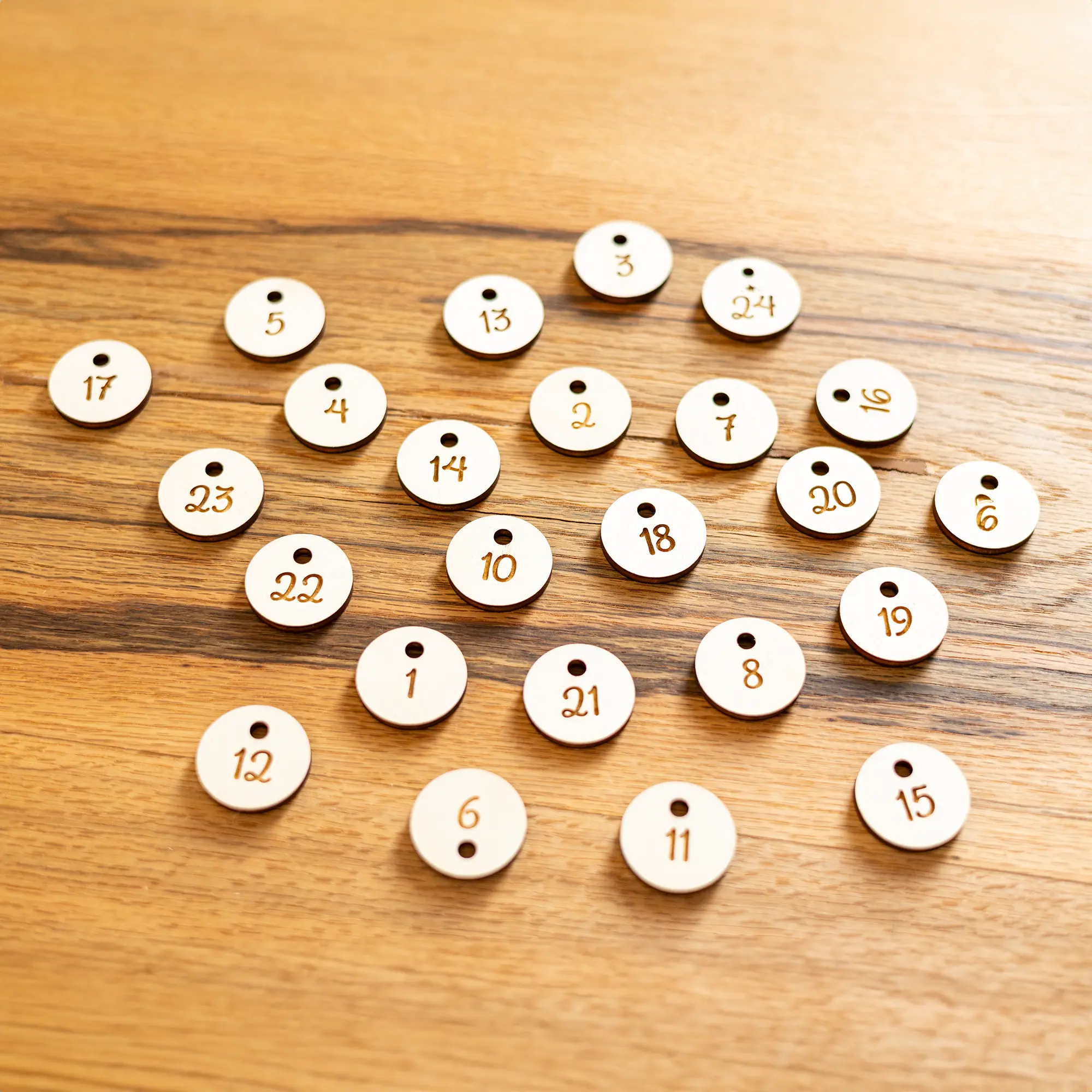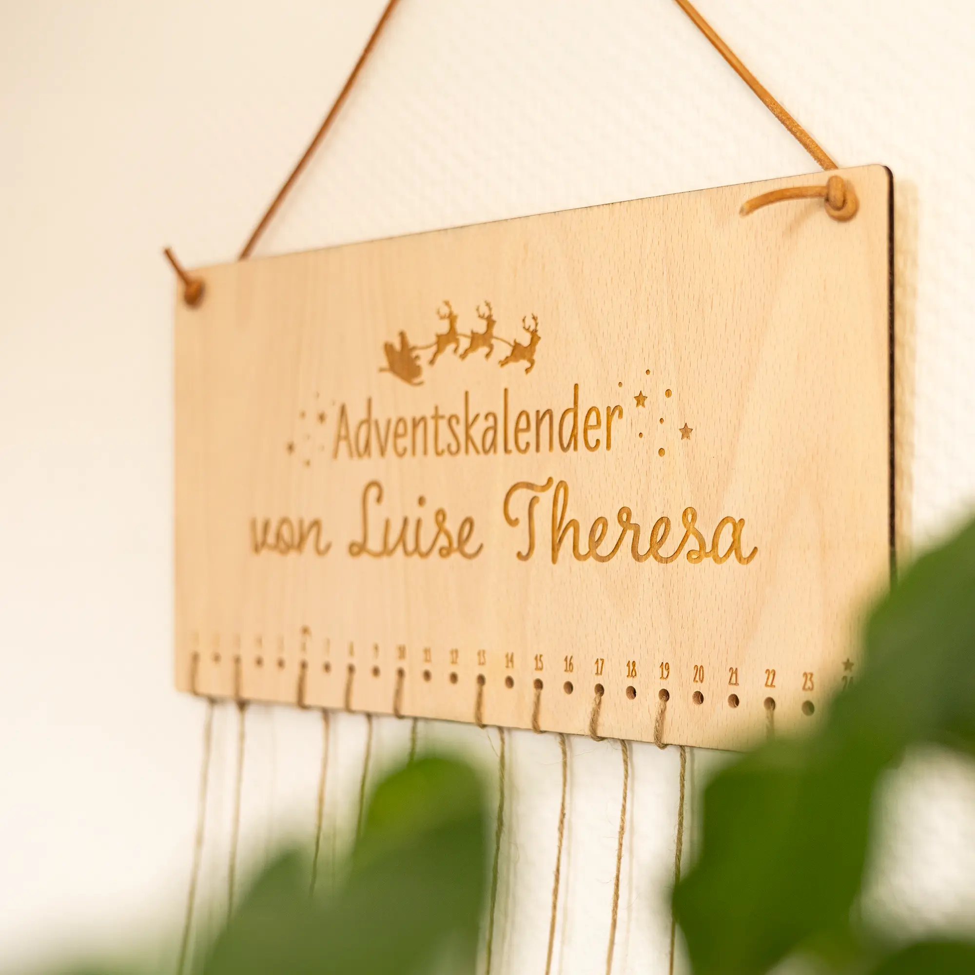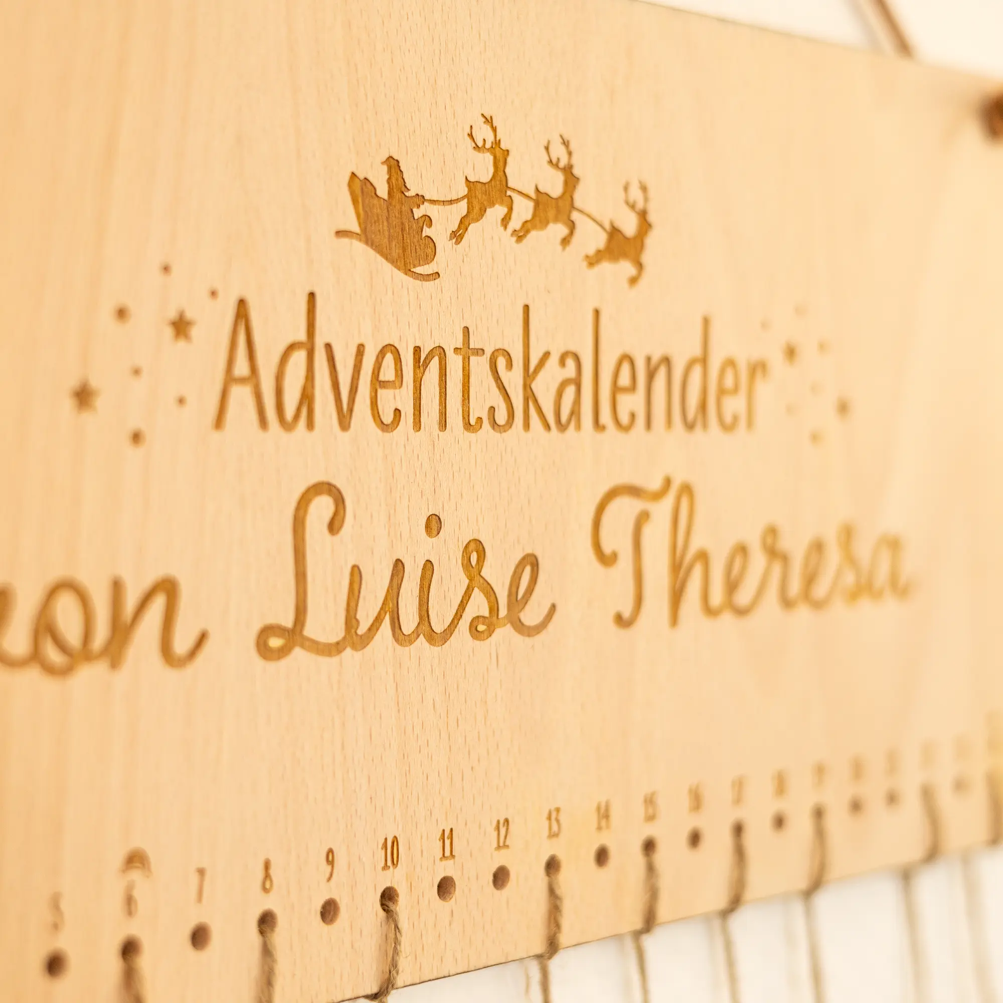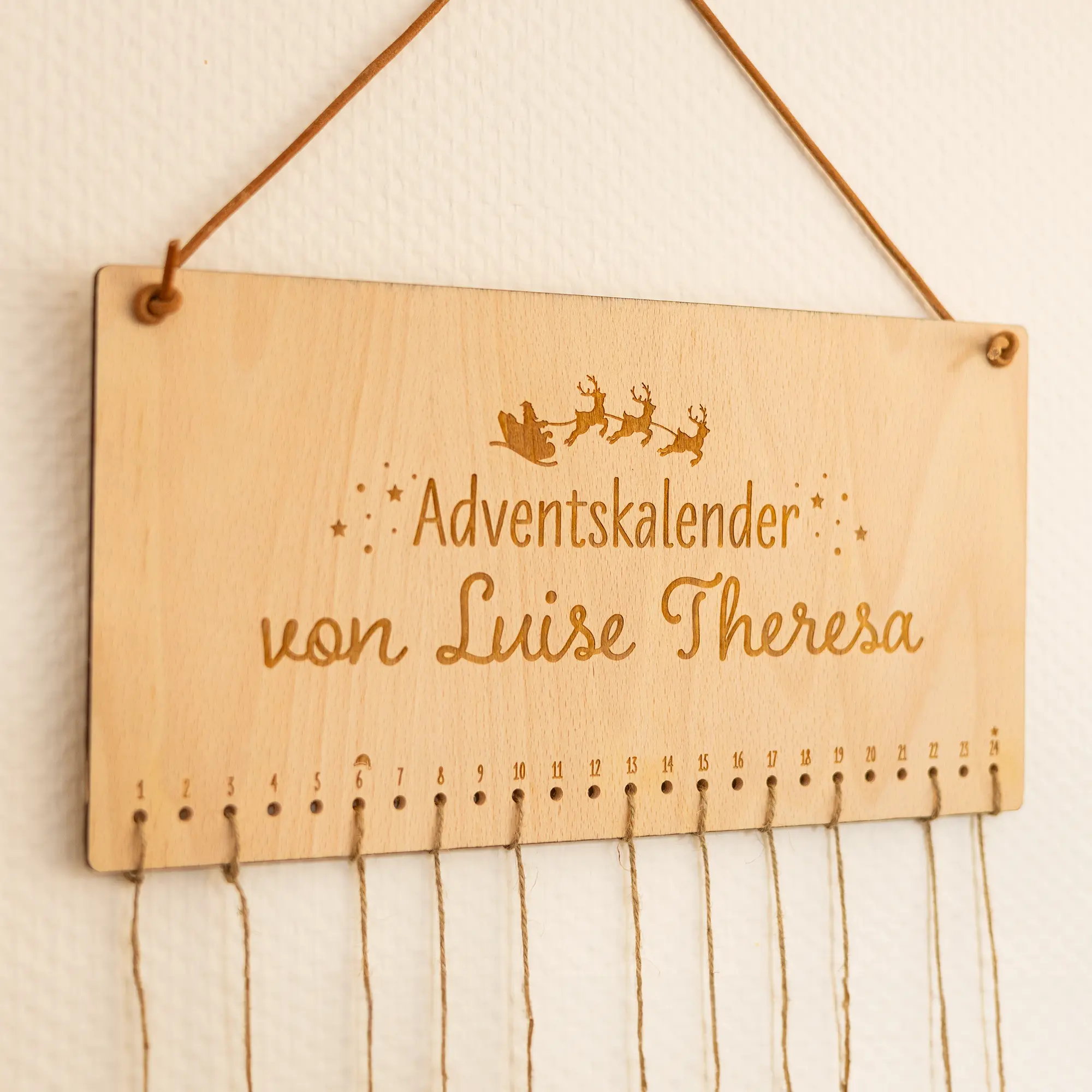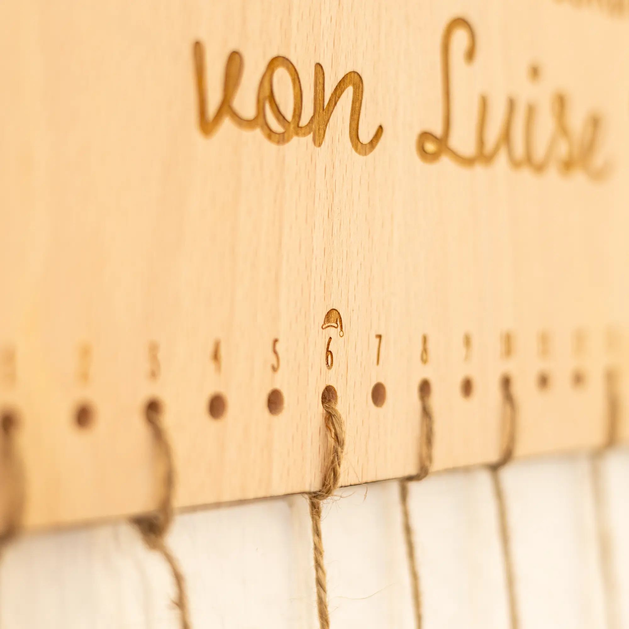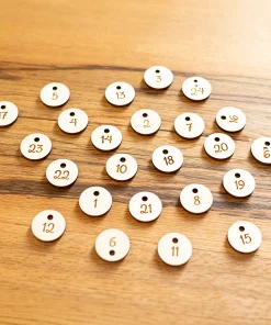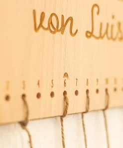 An der Oberseite befinden sich zwei Löcher, um den Adventskalender mit einem Seil an die Wand im Wohnzimmer, Kinderzimmer oder anderen Wunschorten zu hängen. An den unteren Löchern kann jeweils ein Säckchen* mit einem Seil am Kalender befestigt werden. Für die 24 Löcher habt ihr außerdem noch die Möglichkeit, Nummern-Plättchen passend zu den 24 Adventstagen zu bestellen. Diese sind, wie der Adventskalender auch, mit 5 mm großen Löchern versehen, sodass die Nummern perfekt an die Säcke gebunden werden können.
