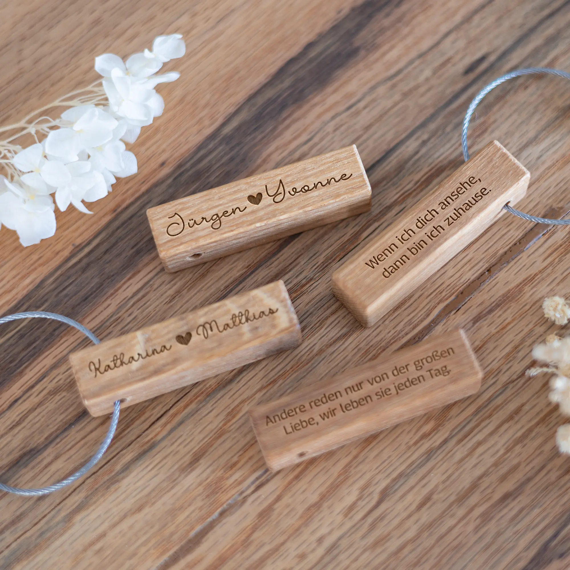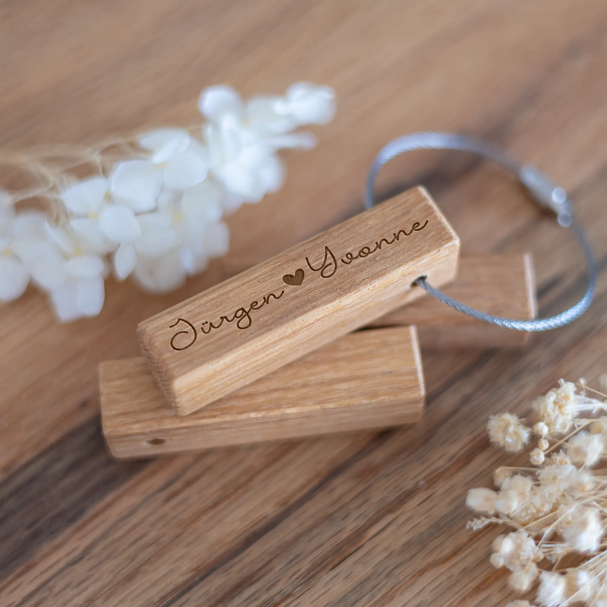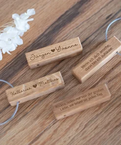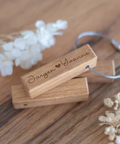 Unser personalisierter Schlüsselanhänger ist ein ideales kleines Geschenk für jede Gelegenheit! Auf das Stäbchen aus geöltem Eichenholz könnt Ihr Euren Namen und den eures Partners oder eurer Partnerin mitsamt einer kleiner Liebesbotschaft eingravieren lassen. Abgerundet wird das ganze durch ein kleines Herz zwischen den Namen. Dadurch wird der kleine Anhänger zu einem ganz besonderen Geschenk und das nicht nur zum Valentinstag, sondern auch zu eurem Jahrestag, eurer Verlobung oder einfach als kleine romantische Geste, welche ganz einfach an den Schlüsselbund angebracht werden kann.