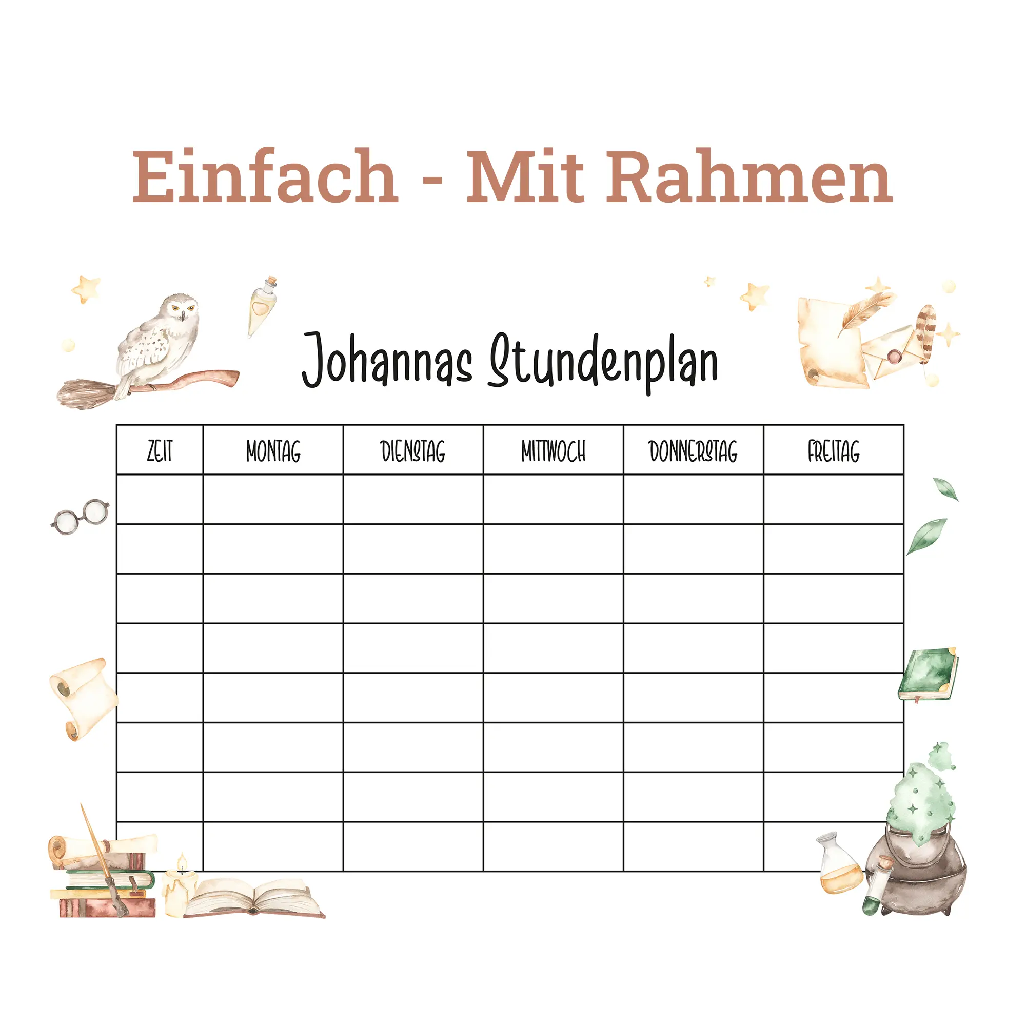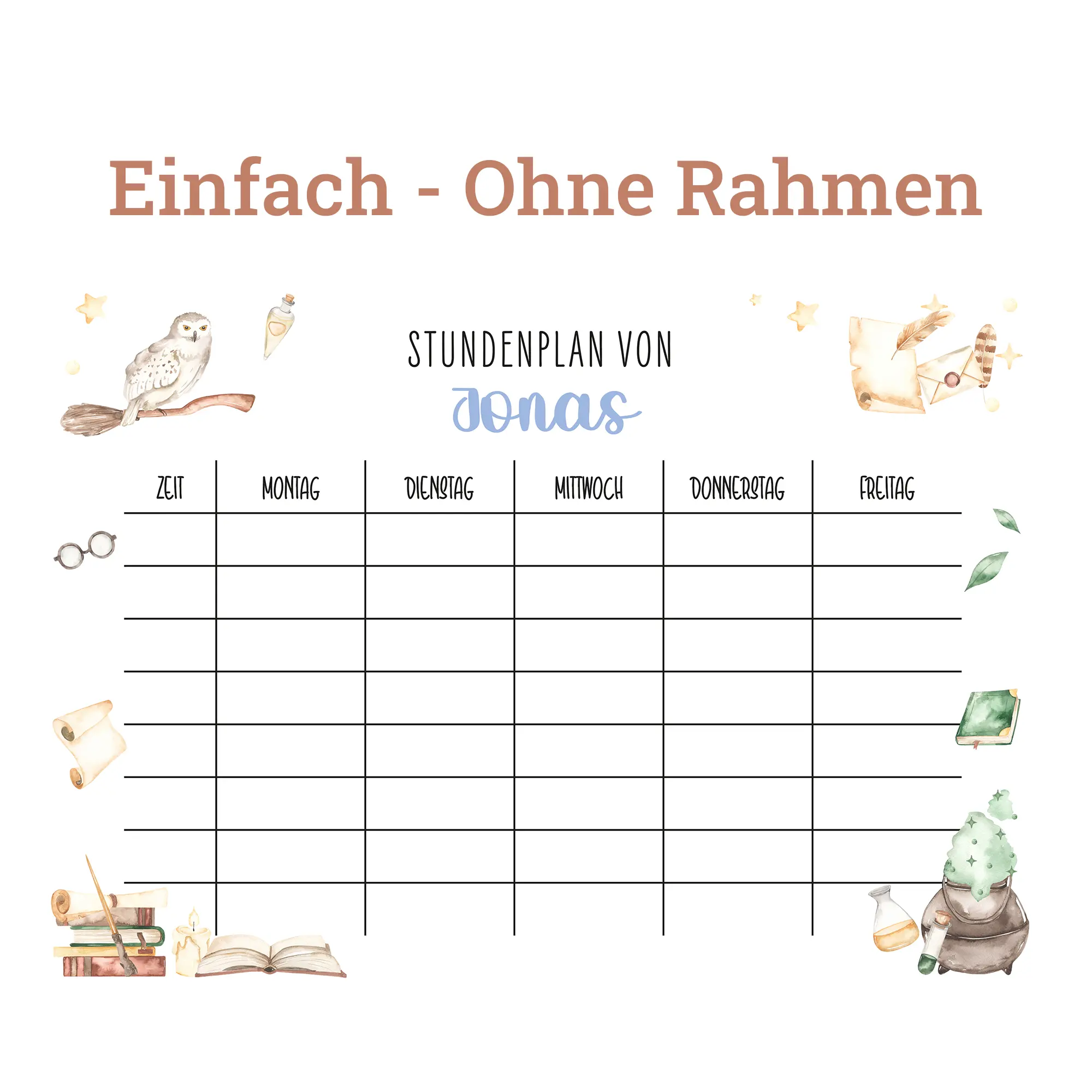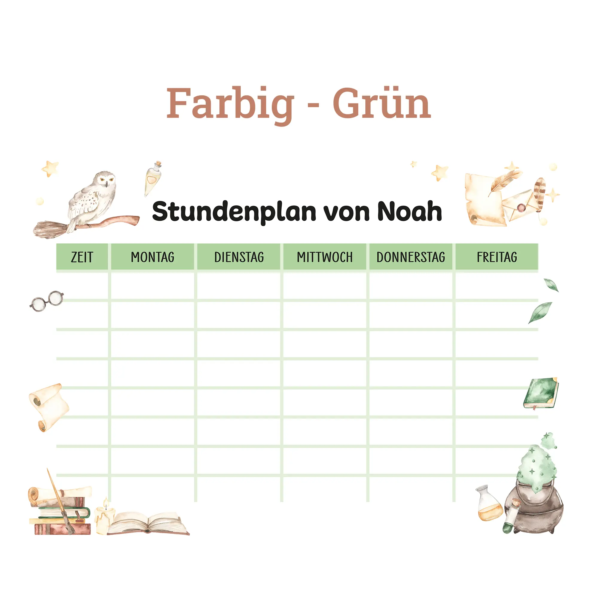 Durch die Vielzahl an Gestaltungsmöglichkeiten – ob bei Schriftart, Farben oder der Namensgestaltung – könnt ihr den Stundenplan ganz individuell anpassen. In Kombination mit den verschiedenen magischen Motiven wie einer Eule, Zaubertränke, fliegenden Besen und mehr entsteht ein einzigartiger Rahmen für jedes Kind. Wer mehrere Stundenpläne bestellt, kann für jedes Kind ein eigenes Design wählen – ganz persönlich und unverwechselbar. Zusätzlich liefern wir einen stabilen Aufsteller aus robustem Buchenholz mit, der dem Stundenplan einen sicheren Stand auf Schränken oder Kommoden verleiht. Auch hier gilt: Alles, was ihr aufschreibt, lässt sich dank der Glasoberfläche ganz einfach wieder entfernen – für eine lange und flexible Nutzung. Ein ideales Einschulungsgeschenk – für Jungen wie Mädchen gleichermaßen!