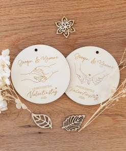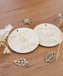 Ihr habt euren ersten Valentinstag und möchtet eurem Liebsten oder eurer Liebsten ein ganz besonderes und persönliches Geschenk machen? Mit unserem runden personalisierten Anhänger für euren ersten Valentinstag könnt Ihr eurem Geschenk eine ganz besondere Note verleihen. Durch das Loch im oberen Teil könnt Ihr ganz einfach ein Band durchziehen, um den Anhänger an eurer Valentinstagsüberraschung zu befestigen.