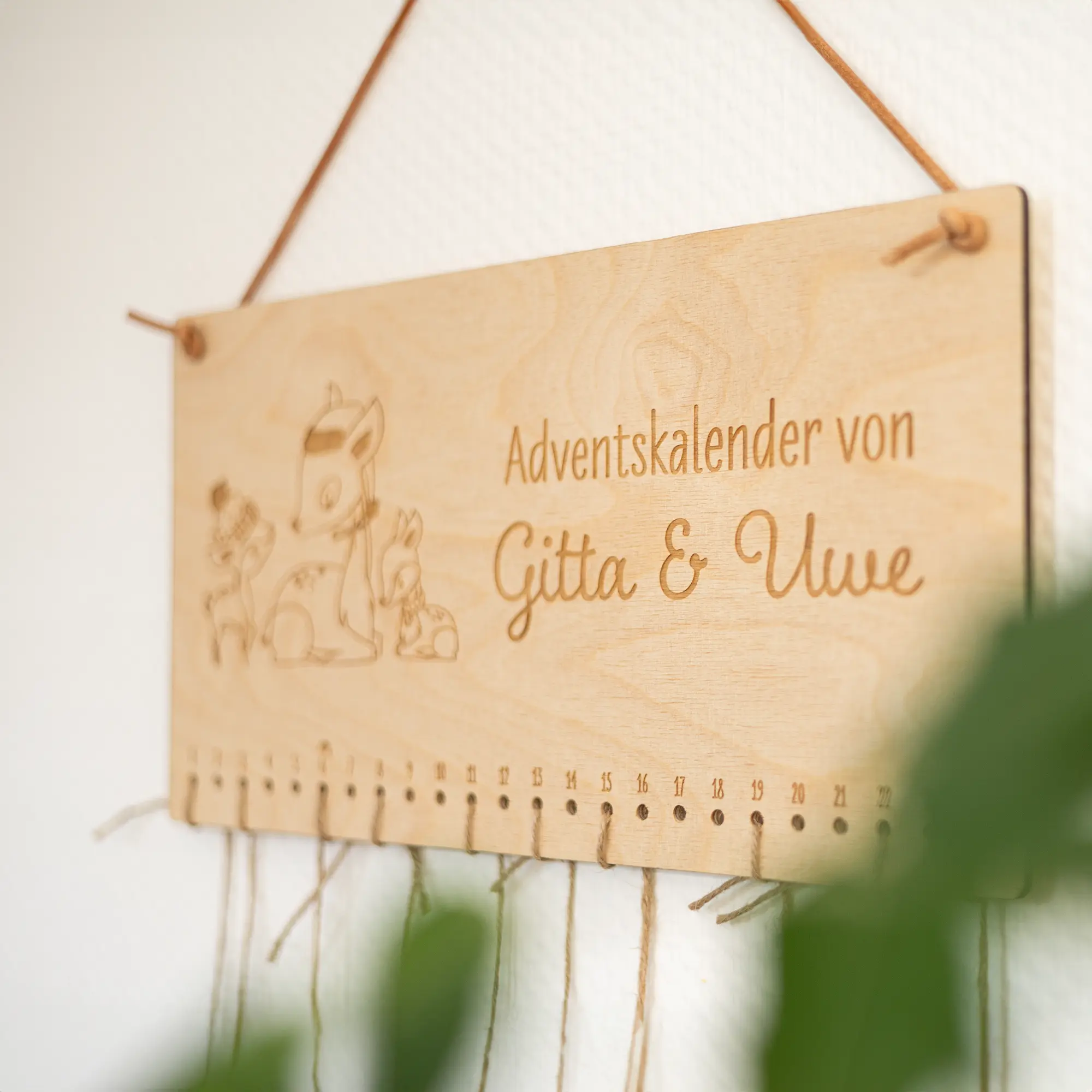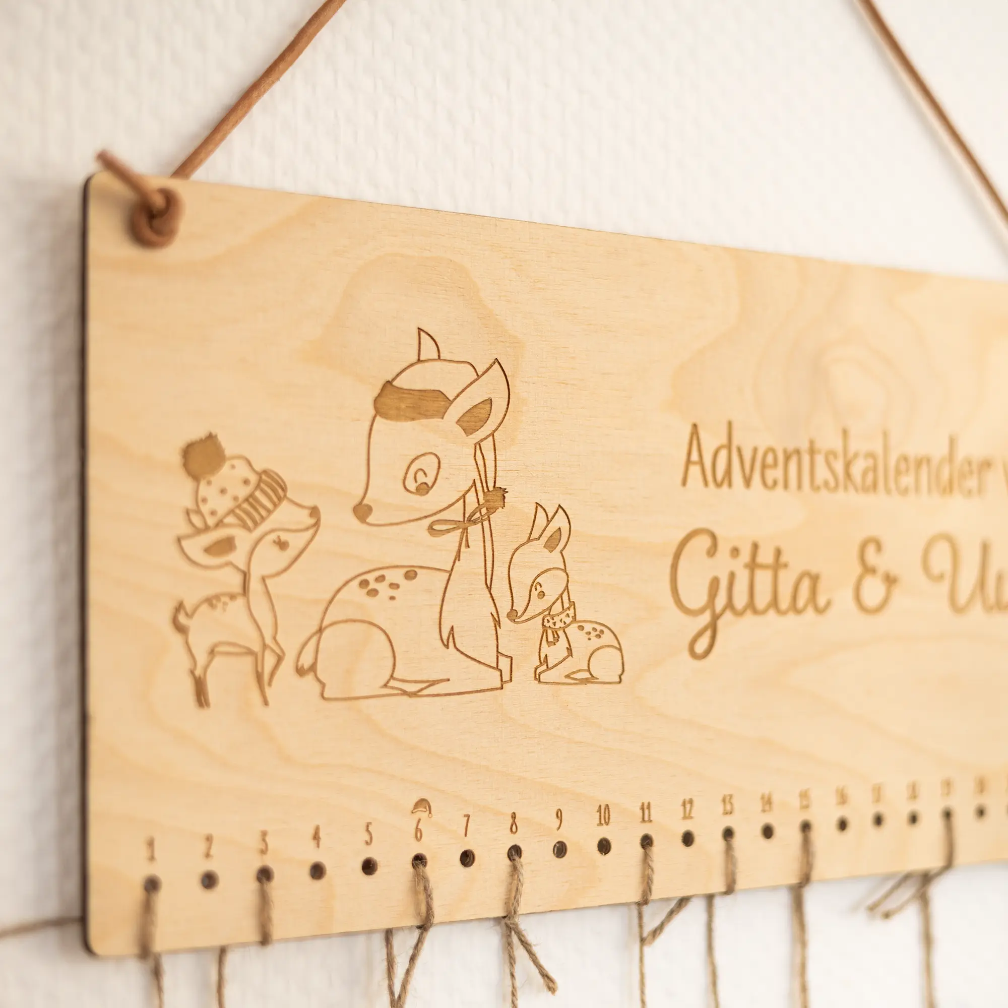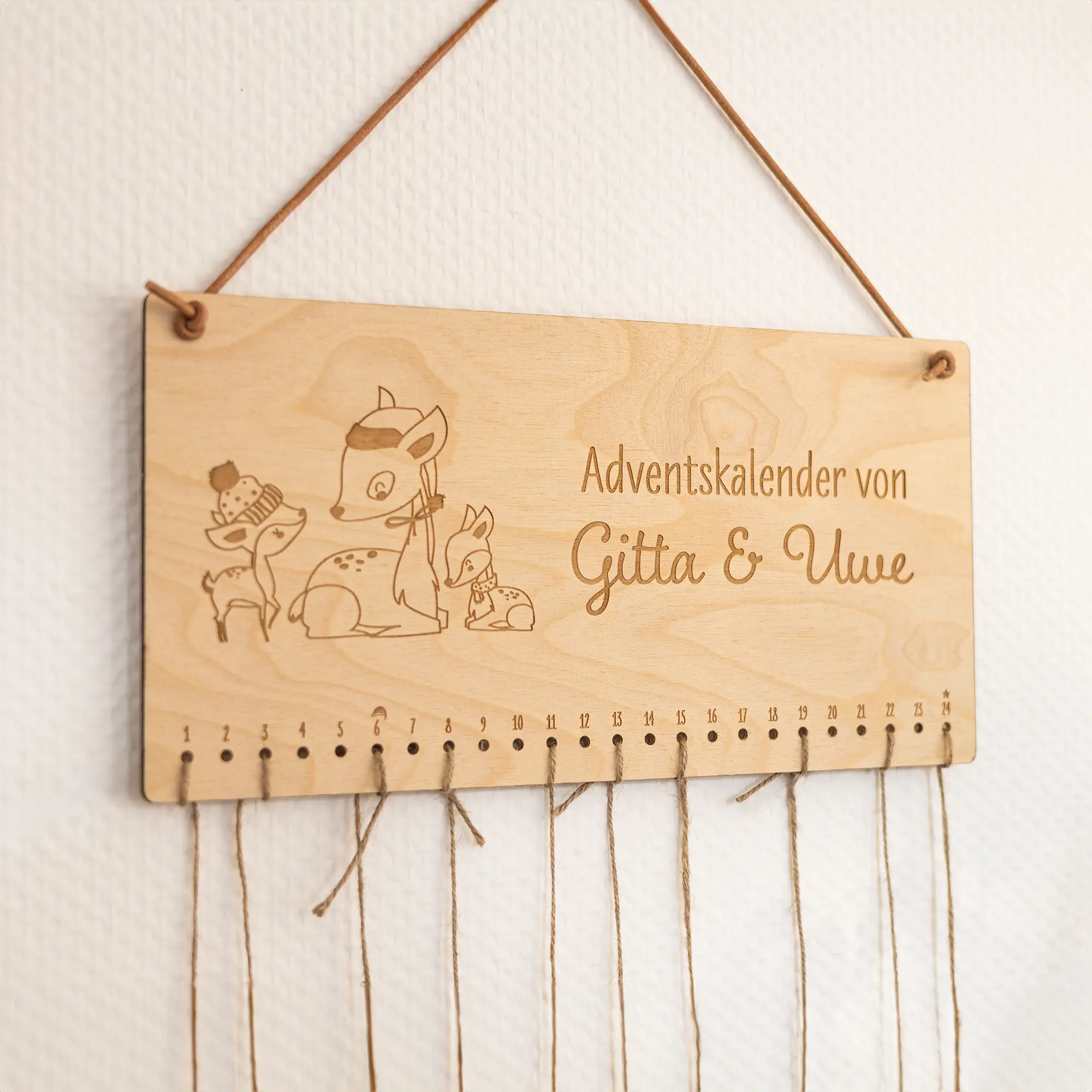 Der personalisierbare Weihnachtskalender aus Holz mit Tiermotiv und Namen verzaubert nicht nur Kinder, sondern ist auch etwas für die Eltern oder Großeltern, welche süße Rentiermotive gerne haben. Der Weihnachtskalender für große und kleine Leute überzeugt durch ein hübsches und weihnachtliches Tiermotiv und kann mit euren Wunschnamen personalisiert werden, welche mit einer präzisen Lasergravur in das Holz graviert wird. Bei euren Namen könnt ihr sowohl einen einzelnen als auch Doppel- oder Familiennamen eintragen, ganz wie es euch beliebt. Dabei stehen für euch zusätzlich und für eine weitere Individualisierung unterschiedliche Schriftarten zur Auswahl.