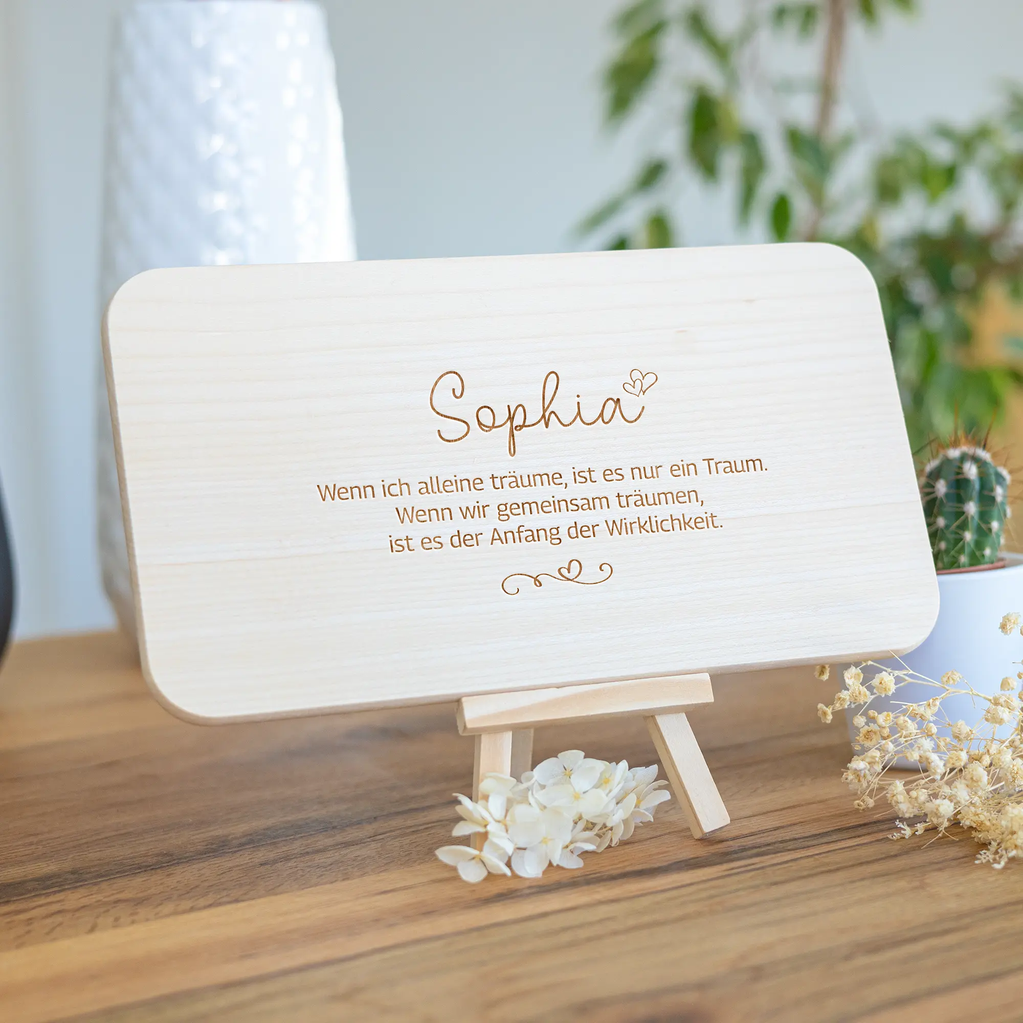 Natürlich könnt ihr statt eines Namens auch zwei auf das Frühstücksbrettchen gravieren lassen. Wer das Frühstücksbrett als Deko ausstellen möchte, kann optional auch eine kleine Staffelei zum Aufstellen mitbestellen. So könnt Ihr das Brettchen Problemlos an jedem Ort platzieren.