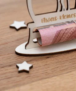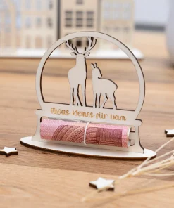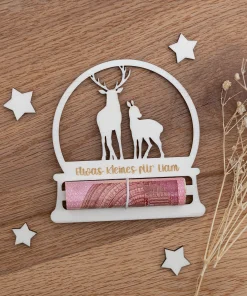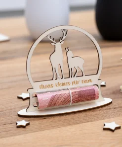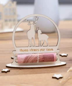 Macht das Verschenken von Geld zu einem besonderen Erlebnis mit unserem eleganten Geldgeschenk aus Holz mit Rentiermotiv! Diese liebevoll gestaltete Karte ist nicht nur eine kreative Möglichkeit, Geldgeschenke zu überreichen, sondern auch ein zauberhaftes Deko-Element unter dem Weihnachtsbaum oder an einem Geschenk. Ihr könnt das personalisierte Geldgeschenk optional entweder mit einem ovalen Standfuß für eine attraktive Präsentation aufstellen oder es mit einem praktischen Loch zum Aufhängen bestellen. So könnt Ihr euer Geldgeschenk nach euren Vorlieben präsentieren.