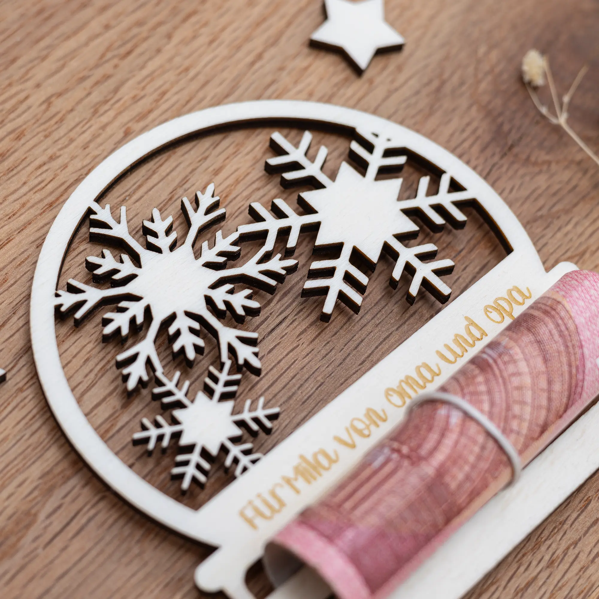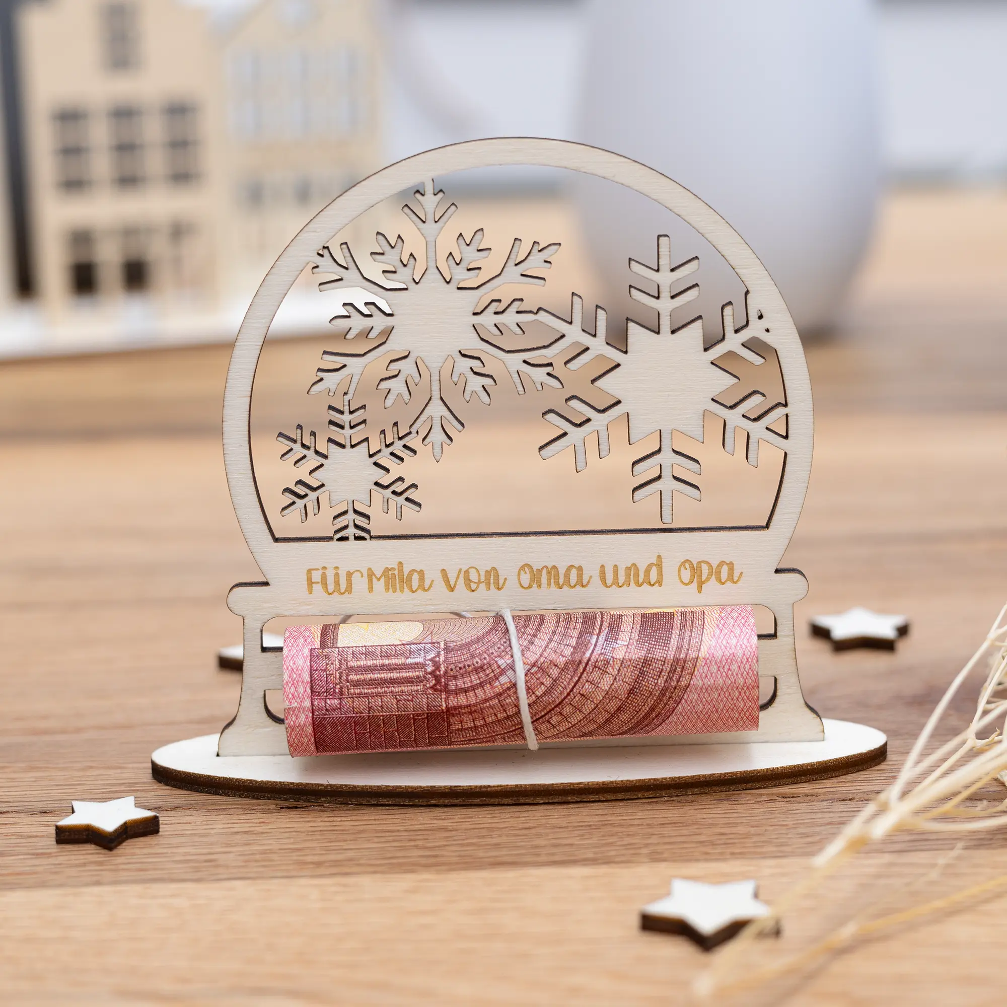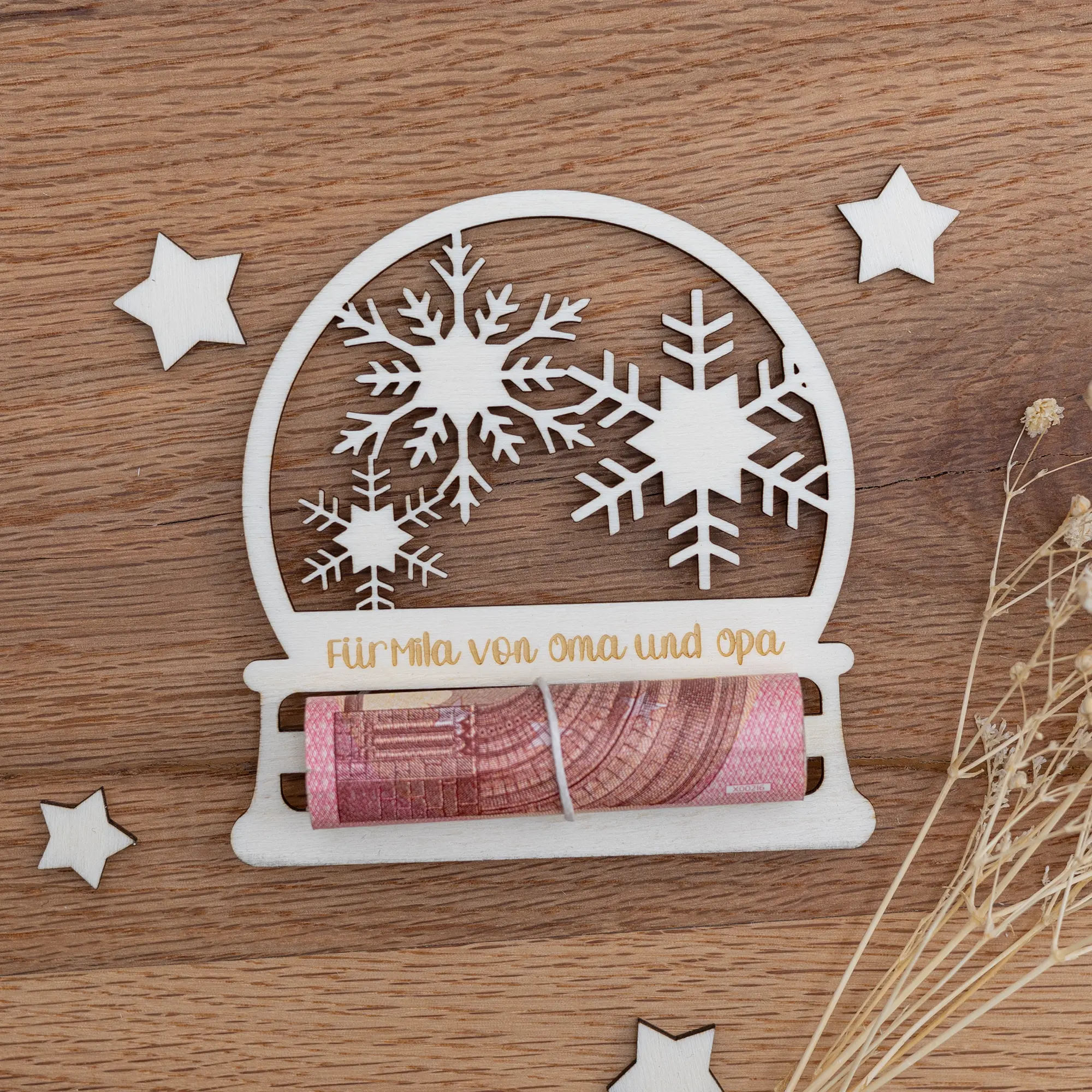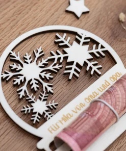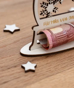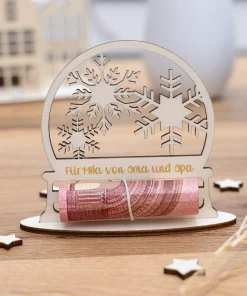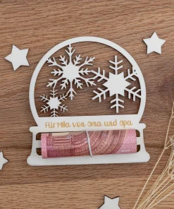 Unser personalisiertes Geldgeschenk Schneekugel ist ideal dafür geeignet auf eine kreative und ganz persönliche Art Geld an Weihnachten zu verschenken. Nicht nur ist das Geldgeschenk mit einem wunderschönen Schneekugelmotiv mit Schneekristallen im inneren versehen, sondern Ihr könnt auch eure ganz persönliche Grußbotschaft an den Beschenkten in das Holz gravieren lassen.