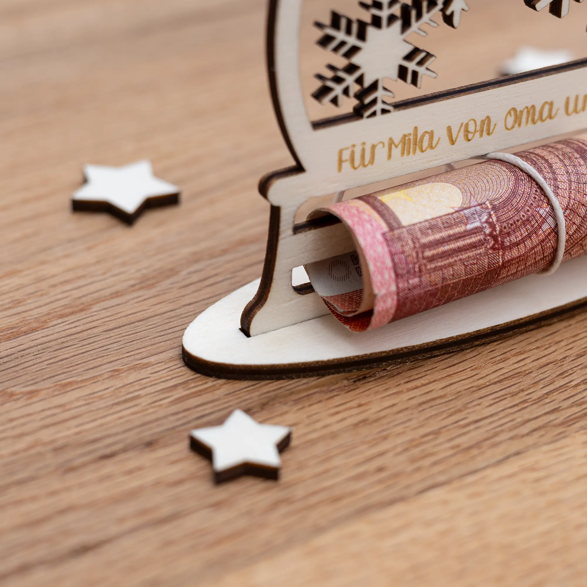 Das Geldgeschenk aus Holz lässt sich wahlweise mit Standfuß, als Anhänger mit Loch oder ohne optionalem Zubehör bestellen. Durch die beiden Schlitze lassen sich Geldscheine bis zu einer Größe von 20€-Scheinen aufrollen. Für breitere Geldgeschenke könnt Ihr uns aber jederzeit kontaktieren, um eine gemeinsame Lösung zu finden.