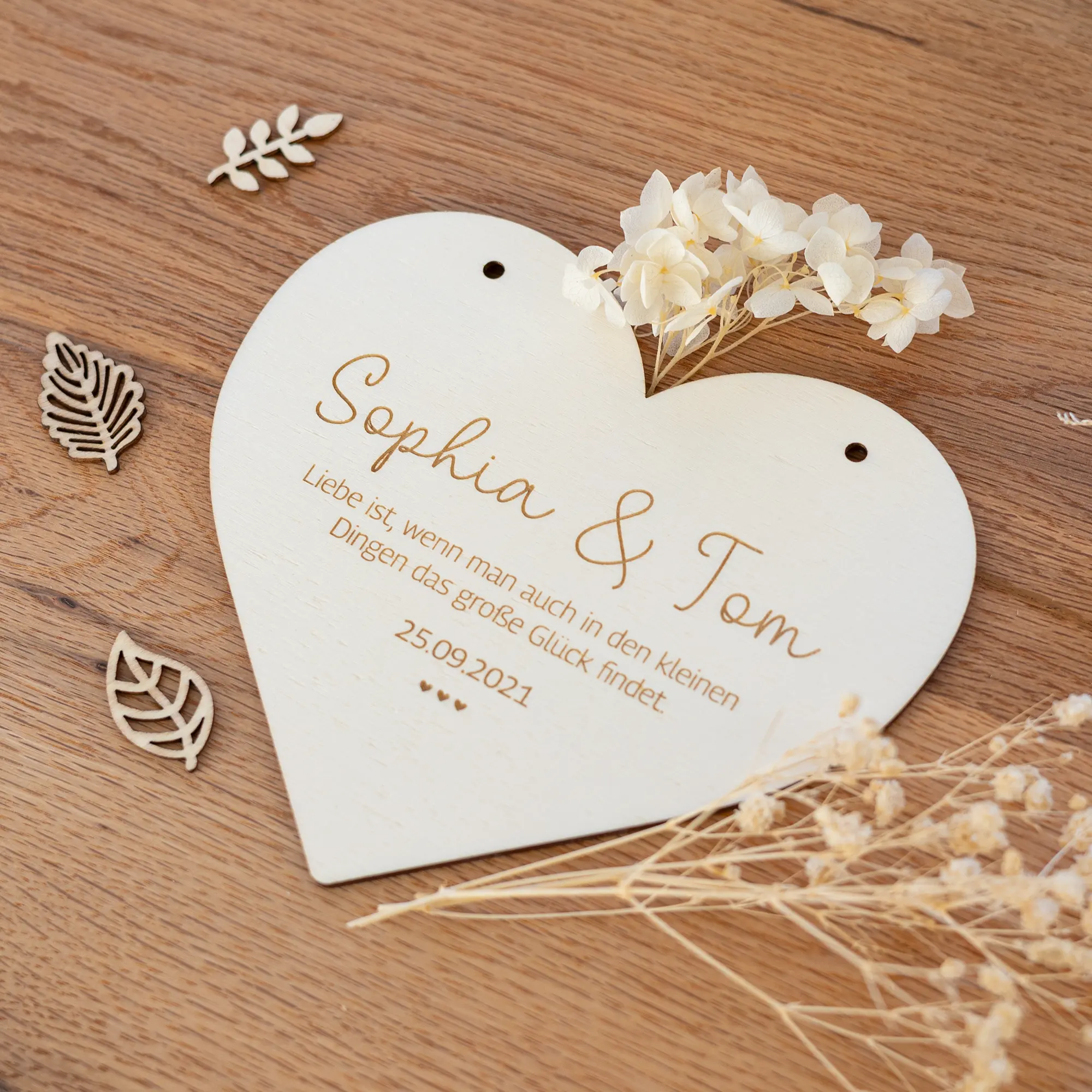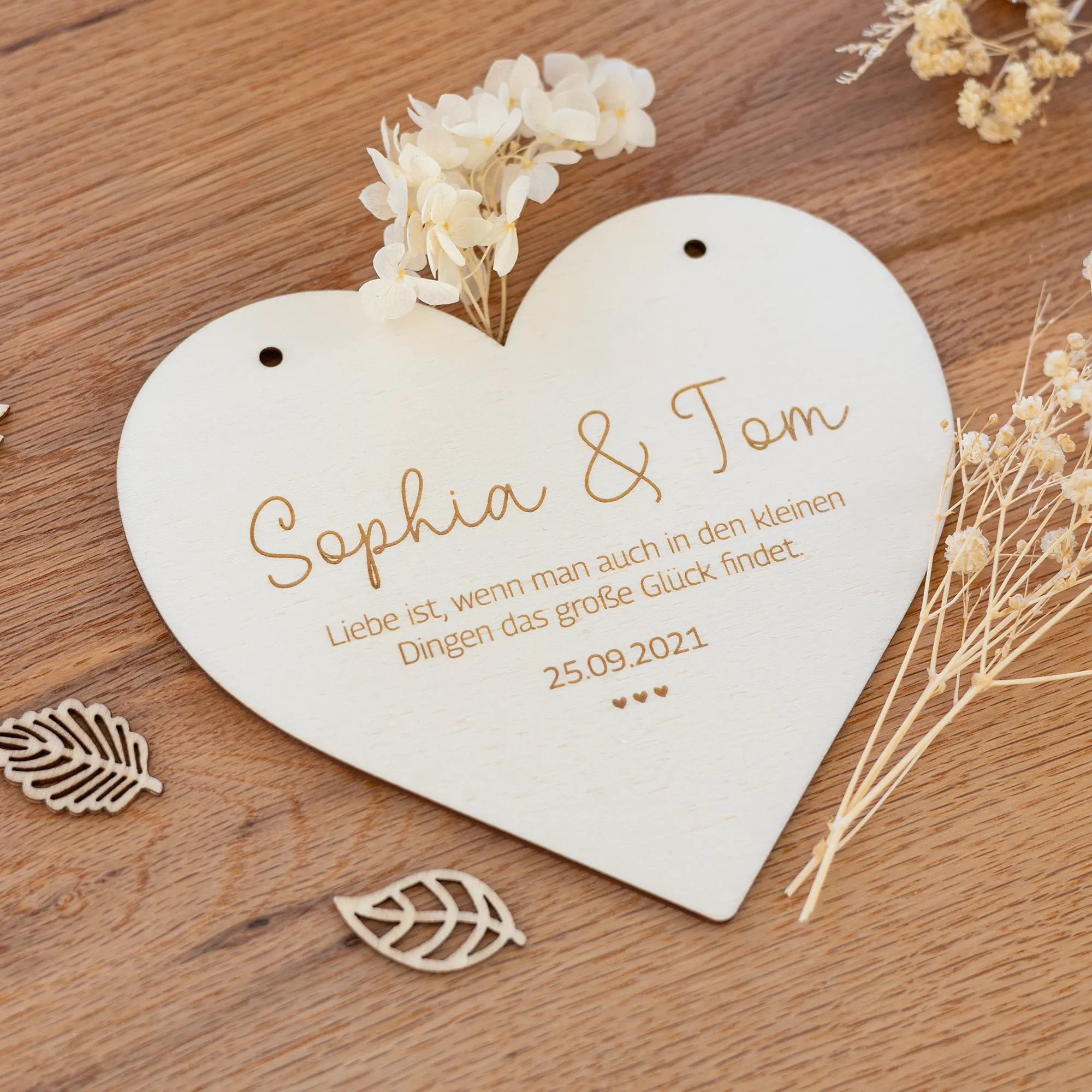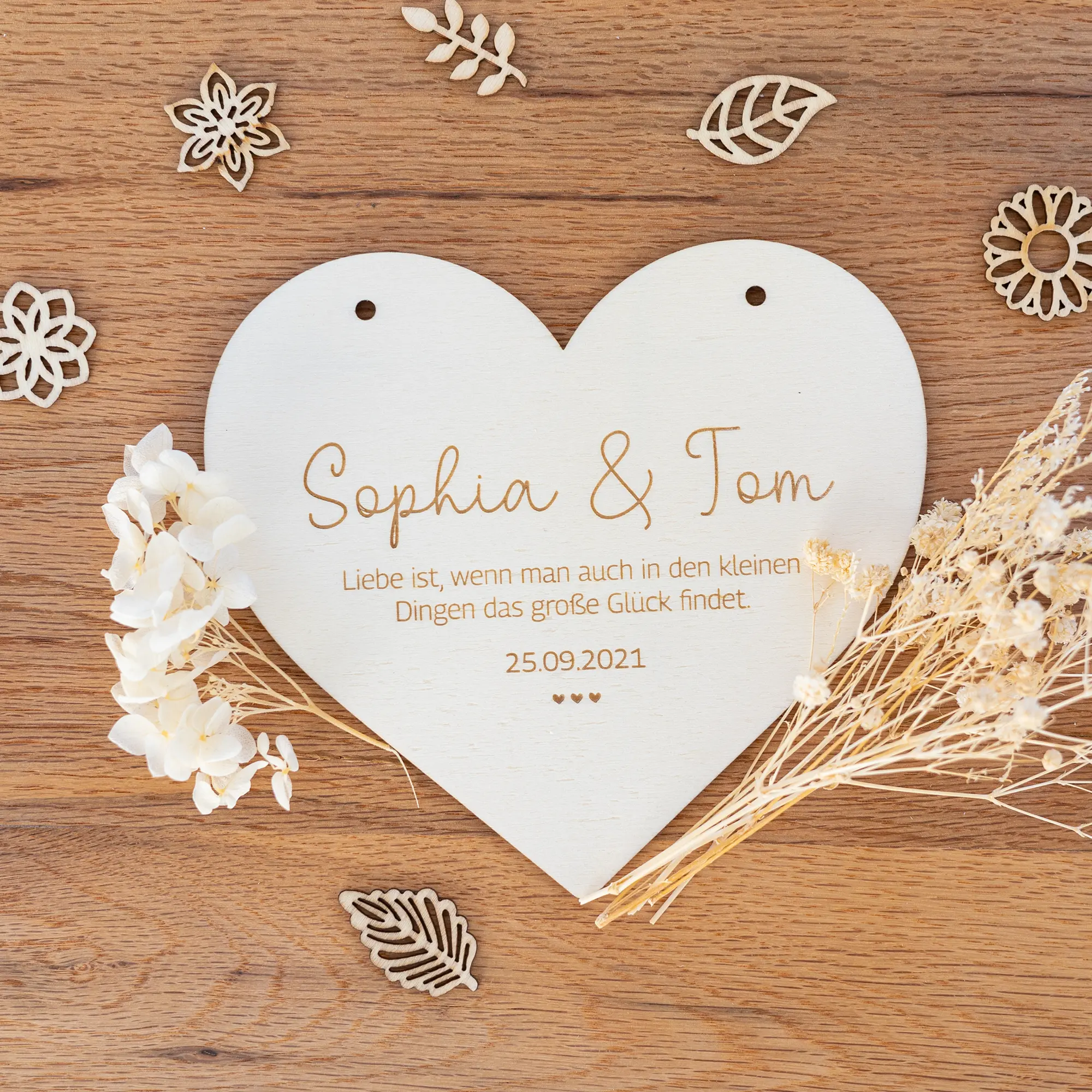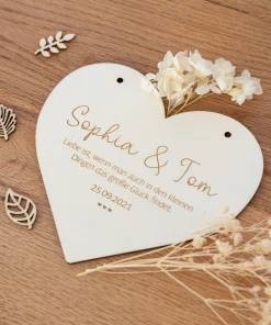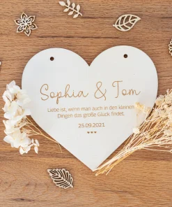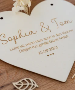 Das Herz eignet sich prima als Tischdekoration für Zuhause, in Geschenkkörben und auf passenden Veranstaltungen. Optional habt ihr die Möglichkeit, das Herz mit Löchern zum Aufhängen zu bestellen. Das personalisierte Holzherz ist die perfekte Erinnerung an einen ganz besonderen Tag.