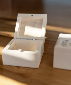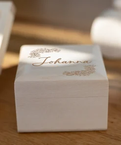 Wähle aus zwölf verschiedenen Schriftarten und zwei Motiven oder lasse bei besonderen Wünschen euer personalisiertes Schmuckkästchen von uns umgestalten. Der warme Holzton und die feine Gravur verleihen der Schmuckschatulle eine rustikale und zugleich schöne Note. Jedes Schmuckkästchen wird in sorgfältiger Handarbeit in Deutschland hergestellt und von uns weiterverarbeitet, wodurch jedes Stück zu einem Unikat wird. Die individuelle Maserung des Holzes und die präzise Lasergravur machen das personalisierte Schmuckkästchen zu einem ganz besonderen Erinnerungsstück für besondere Momente oder als sicherer Aufbewahrungsort für besonderen Schmuck.