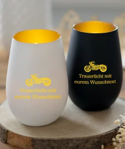 Der Abschied zählt zu den herausforderndsten Momenten im Leben. Besonders schmerzhaft ist es, wenn ein geliebter Mensch für immer geht. In solchen Zeiten ist es oft wichtig, eine bleibende Erinnerung zu haben, an der man festhalten und neue Kraft schöpfen kann. Unser Trauerlicht richtet sich speziell an Trauernde, dessen Verstorbene eine Leidenschaft für das Motorradfahren hatten. Es soll Trost spenden und persönliche Erinnerungen an einen geliebten Menschen bewahren. Ihr habt die Möglichkeit, zu dem Motorradmotiv euren eigenen, individuellen Text eingravieren zu lassen. Hierbei stehen euch verschiedene, an den Anlass angepasste Schriftarten zur Auswahl. Zudem könnt ihr die Formatierung eures Textes angeben, um ihn nach euren Vorstellungen auszurichten. Ob kurze Gedichte, liebevolle Erinnerungen oder einfach nur Name sowie Geburts- und Sterbedatum des Verstorbenen – alles kann graviert werden.
