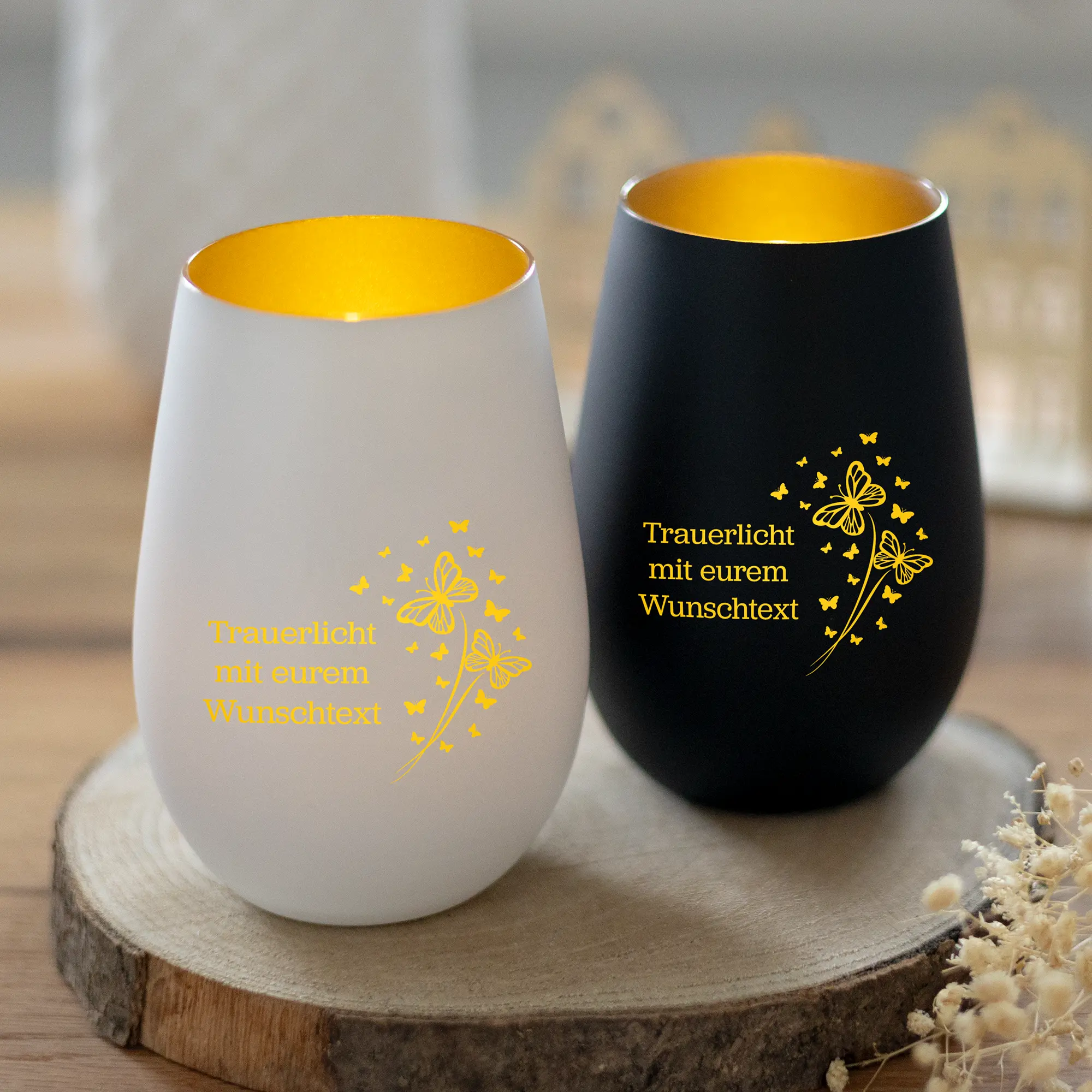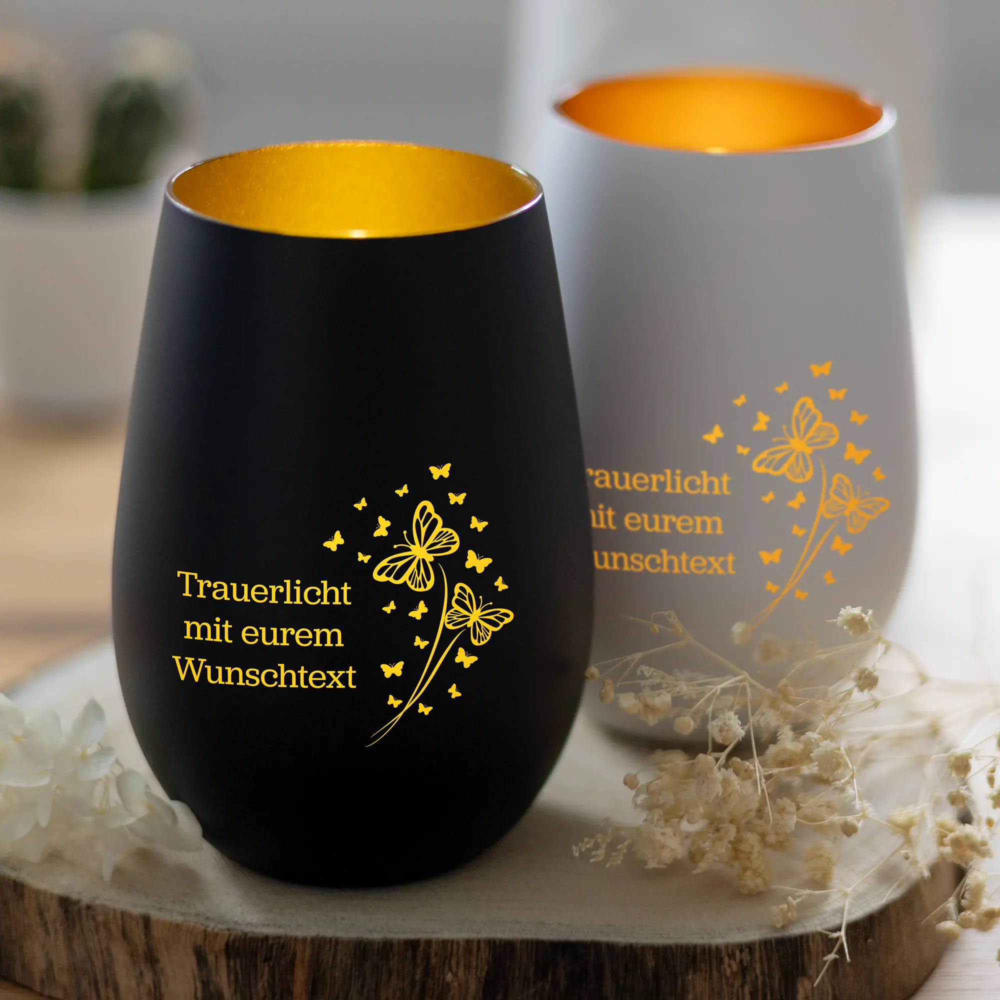 In Zeiten des Abschieds und der Trauer sind die Erinnerungen an geliebte Menschen von unschätzbarem Wert. Unsere Trauerlichter mit Schmetterlingsmotiv ermöglichen es euch, diese Erinnerungen auf eine ganz besondere Weise festzuhalten. Jedes Licht kann mit einem individuellen Wunschtext versehen werden, der eure Gefühle und Gedanken widerspiegelt. Egal, ob es sich um ein Zitat, ein Gedicht oder einfach den Namen des Verstorbenen handelt – gestaltet euer Licht so, wie es für euch am bedeutendsten ist. Der Wunschtext wird durch ein Motiv mit vielen Schmetterlingen ergänzt, das per Laser in das Glas eingraviert wird, sodass das sanfte Licht einer Kerze hindurchscheinen kann.