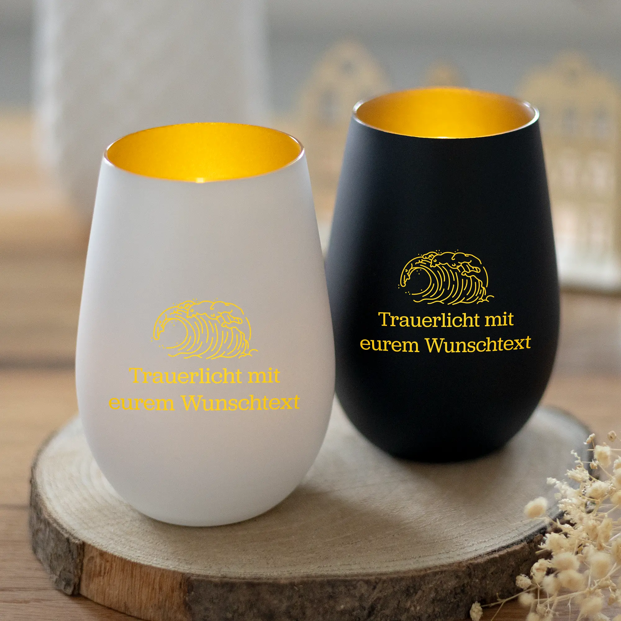 In den Momenten und Zeiten des Abschieds und der Trauer um den von uns gegangenen Menschen sind die Erinnerungen an eben diese von unschätzbarem Wert und von größter Bedeutung. Unser Trauerlicht mit dem einfachen aber dennoch schönen Motiv einer Welle, welche das Meer und die freie See repräsentiert habt ihr die Möglichkeit diese Erinnerungen auf eine ganz besondere Weise festzuhalten. Jedes Windlicht kann mit einem individuellen Wunschtext versehen werden, der an diese ganz besondere Person erinnern soll und der eure Gefühle und Gedanken widerspiegelt. Egal, ob es sich um ein Zitat, ein Gedicht oder einfach den Namen des Verstorbenen handelt – gestaltet euer Licht so, wie es für euch am bedeutendsten ist. Der Wunschtext auf dem Trauerlicht wird durch ein Motiv einer tosenden Welle ergänzt, das per Laser in das Glas eingraviert wird, sodass das sanfte Licht einer Kerze hindurchscheinen kann.