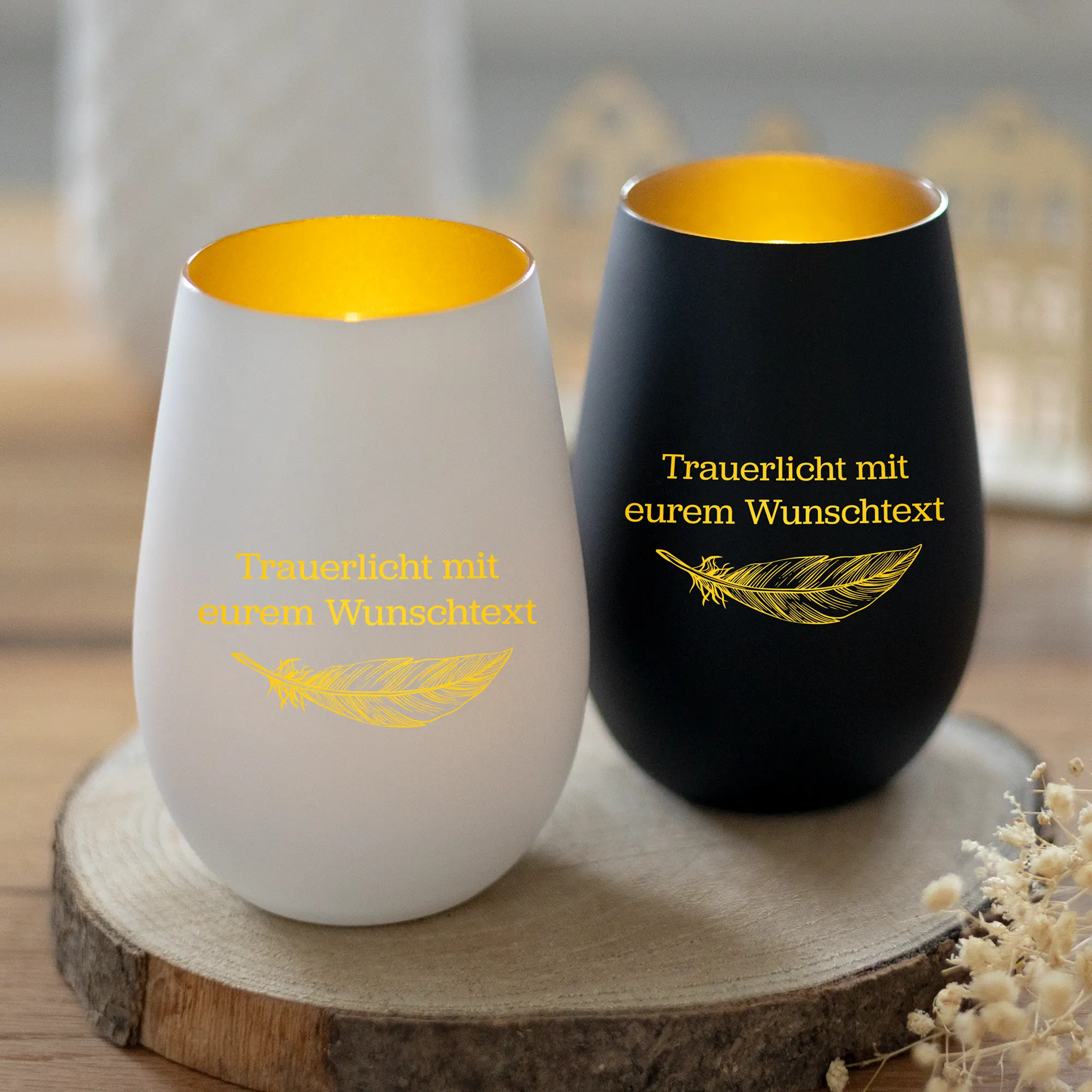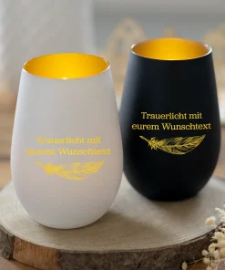 Personalisiertes Trauerlicht mit Wunschtext und Federmotiv