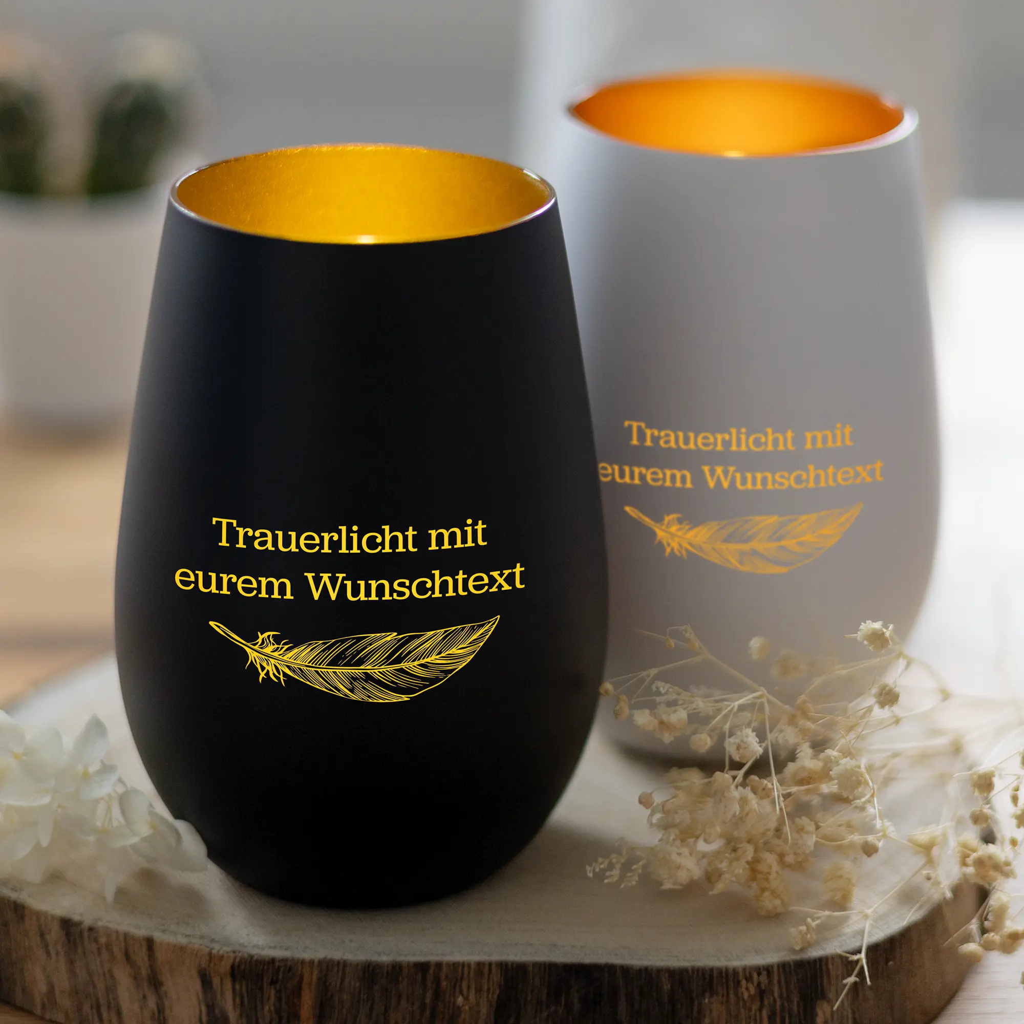 Unsere Trauerlichter mit Wunschtext und Federmotiv bieten eine persönliche Möglichkeit, Erinnerungen an verstorbene geliebte Menschen zu würdigen. Jedes Licht kann individuell gestaltet werden, indem man einen persönlichen Text eingraviert, der zusätzlich mit einer Feder verziert wird. Das Trauerlicht ist ideal als tröstende Erinnerung für Trauernde und symbolisiert Trost und Erinnerung in schweren Zeiten.
