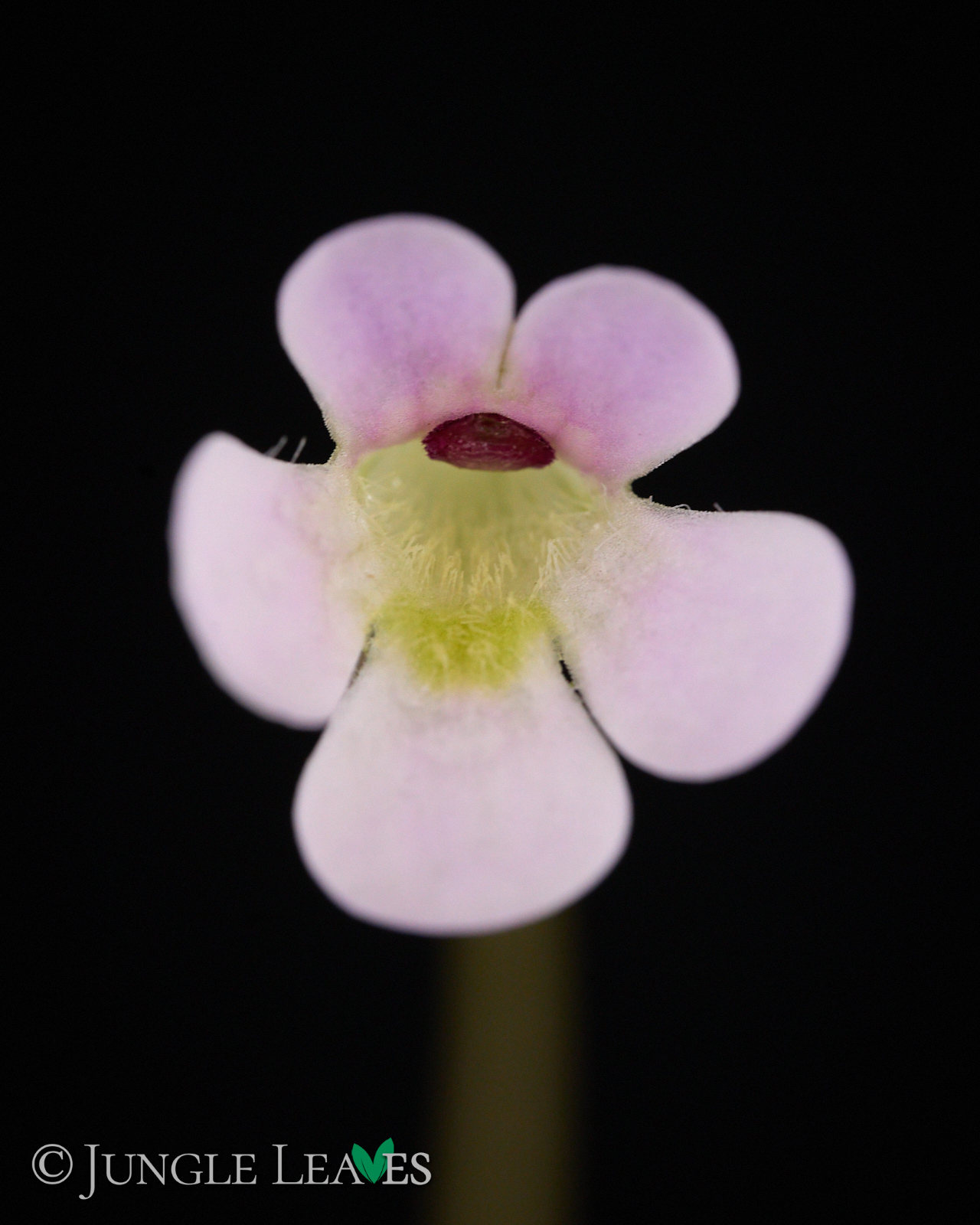 Es erreicht einen Durchmesser von nur ca. 2 cm und blüht an einem langen Blütenstiel mit einzelnen, rosanen Blüten, die fast so groß sind wie die ganze Pflanze.