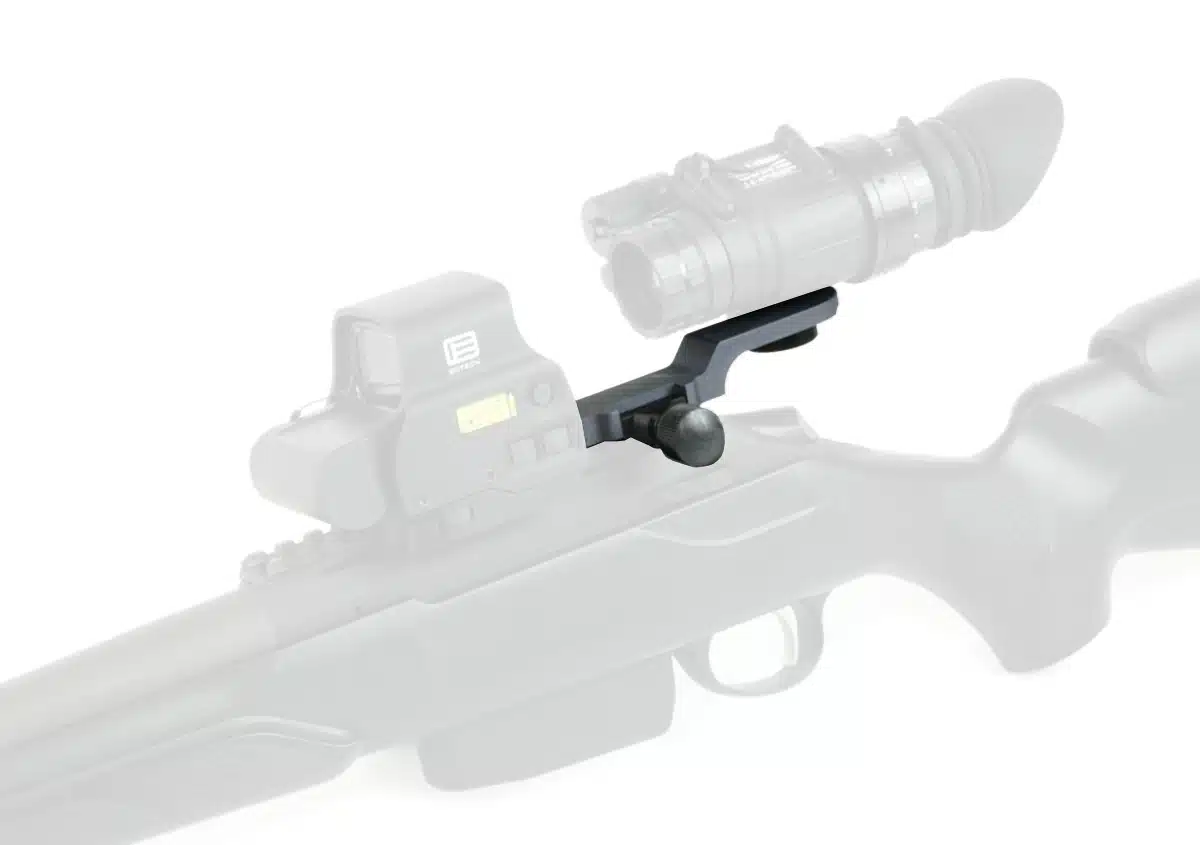 Der PVS14 Montagearm Picatinny ermöglicht die Montage eines PVS14 WEIT HINTER der Zieleinrichtung, wie eines AIMPOINT Rotpunktes! Das PVS14 oder ein anderes Nachtsichtgerät mit gleichem Schraubgewinde kann mit dem PVS14 Montagearm mit Picatinny- oder Weaverschienen Verbindung gekoppelt werden. Das PVS14 wird einfach (siehe Abbildung) mit dem Ring fest durch die Rändelschraube verbunden und bekommt somit eine picatinnyfähige Schnellmontage aus Metall.