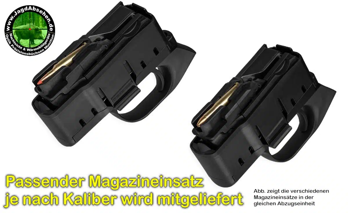 Nach dem Austausch des Magazineinsatzes für das Kleinkaliber, bleibt alles, wie gewohnt: Magazin und Abzugsgruppe der Blaser R8 Ultimate sind zu einer kompakten Einheit verschmolzen, die Magazinentriegelungstasten befinden sich noch immer in idealer Position über dem Abzugsbüge, die Magazinentnahme kann also weiterhin blitzschnell