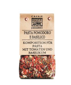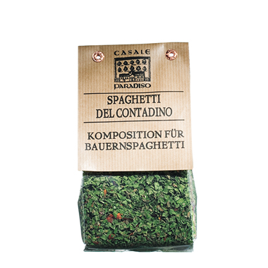 Für Spaghetti, Penne, Fusilli und andere Formate. Basilikum, Petersilie, Schnittlauch, Salz und etwas Chili werden mit Olivenöl und Wasser geköchelt und unter die garen Nudeln gehoben. Aromaschutzpackung. Gewürzmischung.