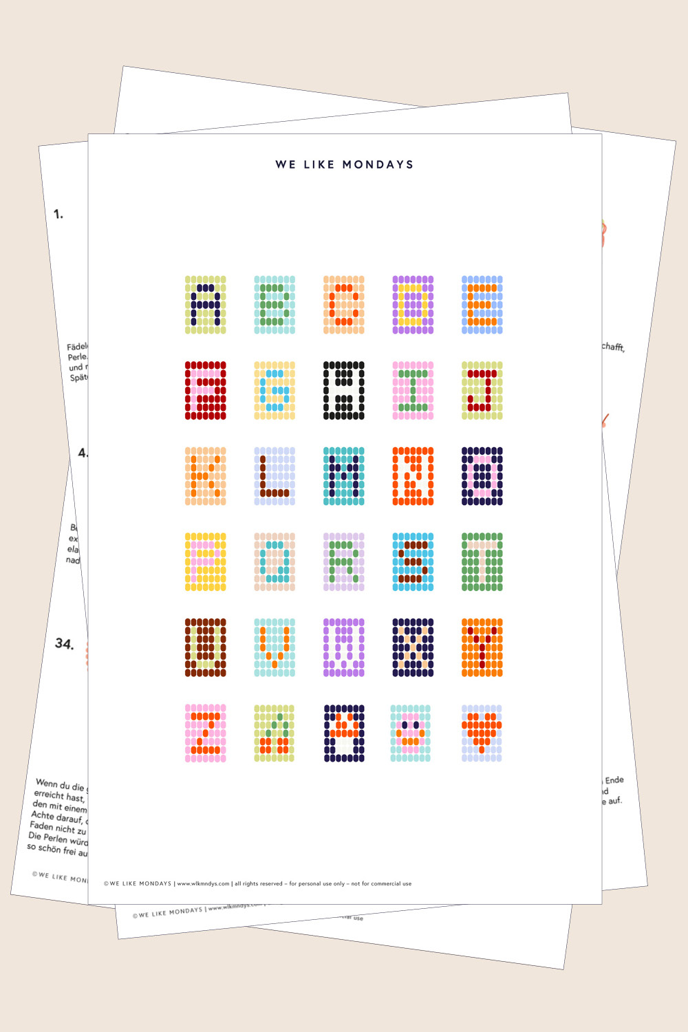 - Inhalt: detaillierte Step-by-Step Fädelanleitung inkl. Buchstabenraster von A bis Z plus die Symbole Kirsche, Pilz, Lachgesicht und Herz.