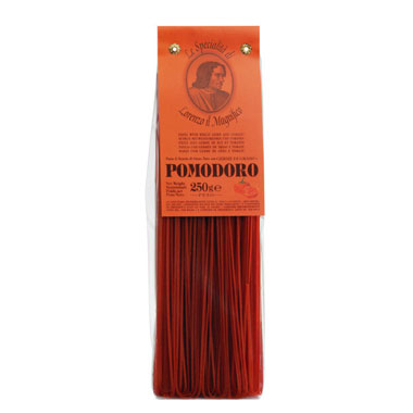Die Farbe allein besticht schon. Das strahlende Rot der Tomatenpasta lässt einen Koch automatisch zu schneeweißem Büffelmozzarella greifen. Die Nudeln sind mild und fruchtig, deshalb sollte man diese Pasta mit zarten Geschmäckern kombinieren. Frische Kräuter, weißer Fisch, Ricotta, Erbsen, gekochter Schinken und Artischocken sind passende Begleiter. Im Biss ist sie ausgesprochen homogen und dank der erhaltenen Weizenkeime außerdem noch ein wertvoller Vitaminspender. Die Produkte der 1860 gegründeten Firma Morelli sind einzigartig, da man im Produktionsprozess den Weizenkeim wieder hinzufügt. Er ist reich an Vitamin E,D und pflanzlichen Proteinen.