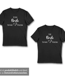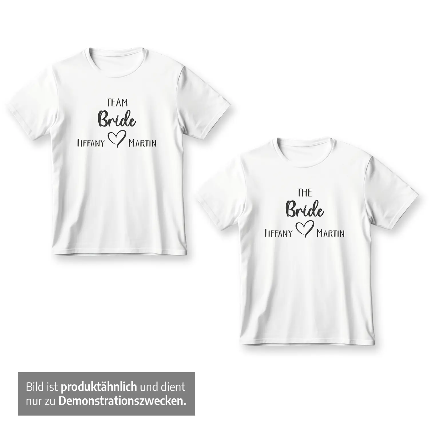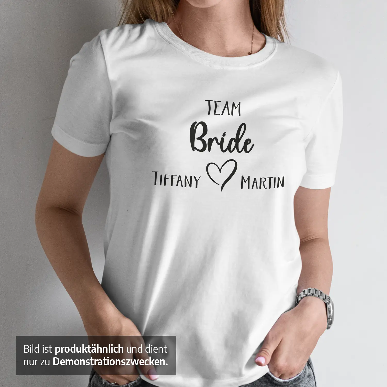 Team Bride – JGA Frauen T-Shirt, personalisiert mit Namen des Hochzeitspaars