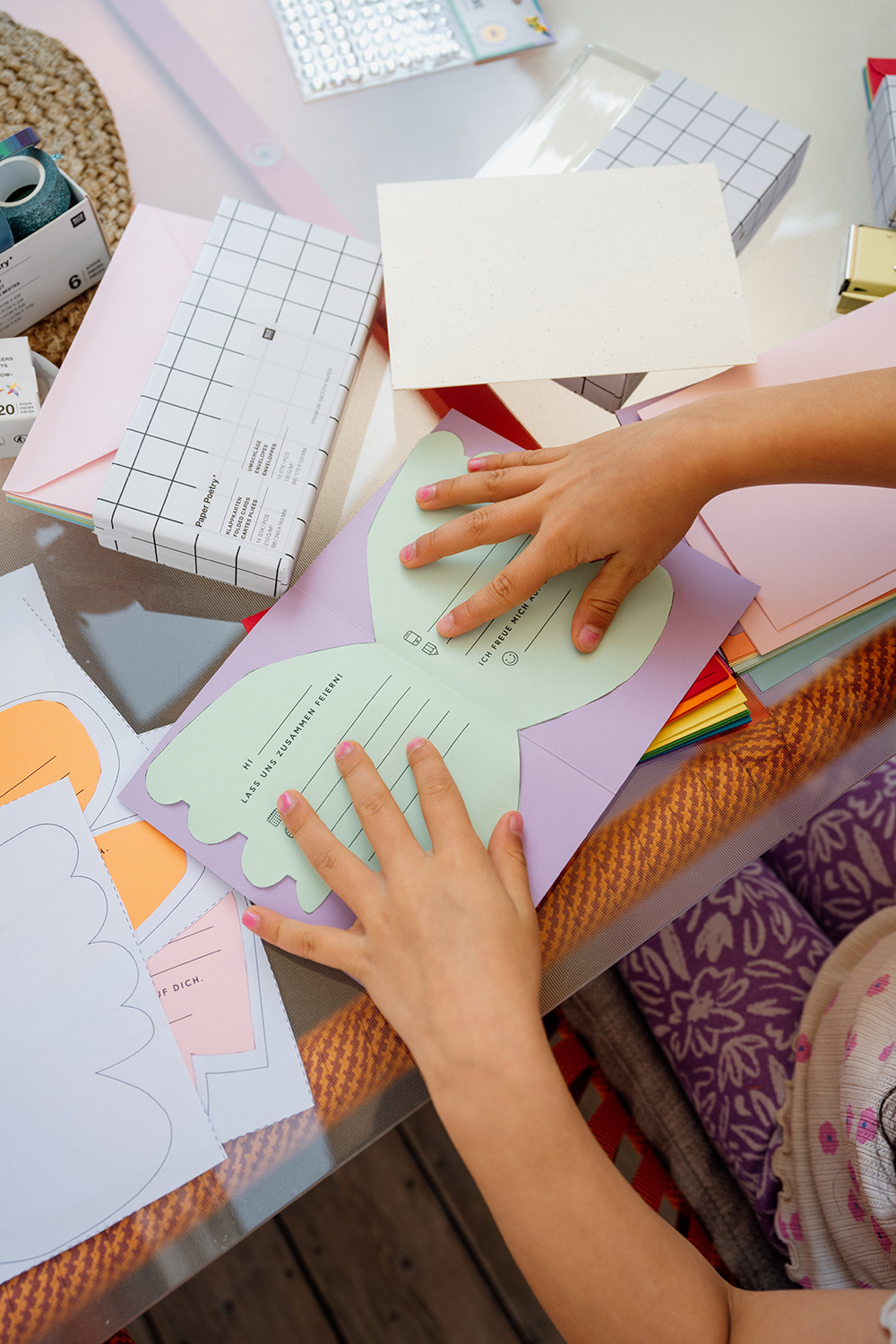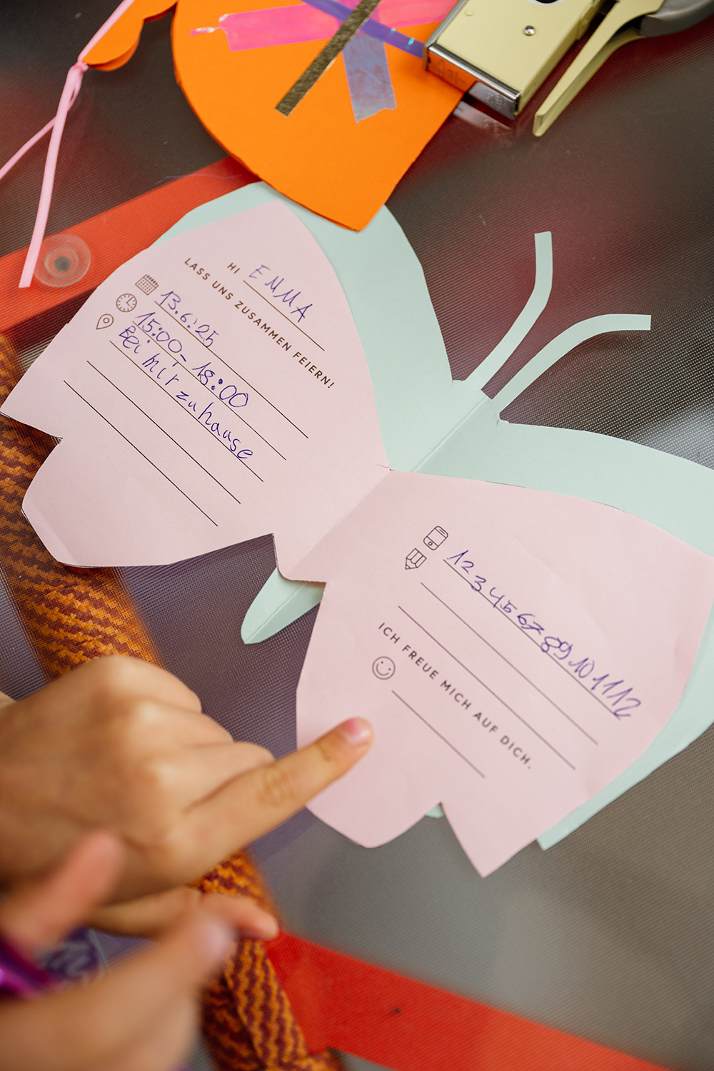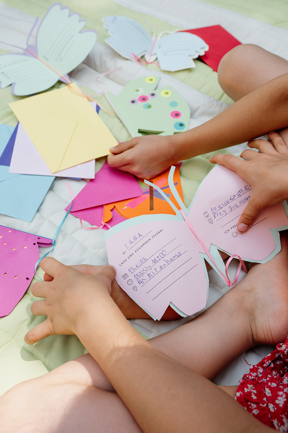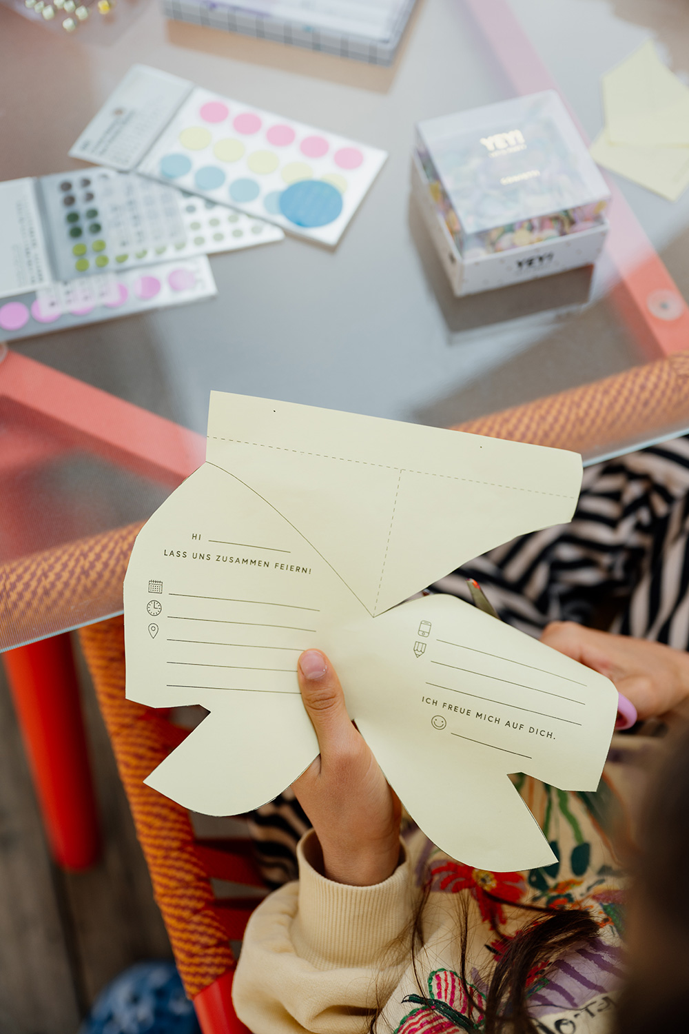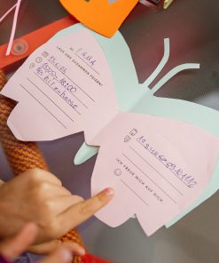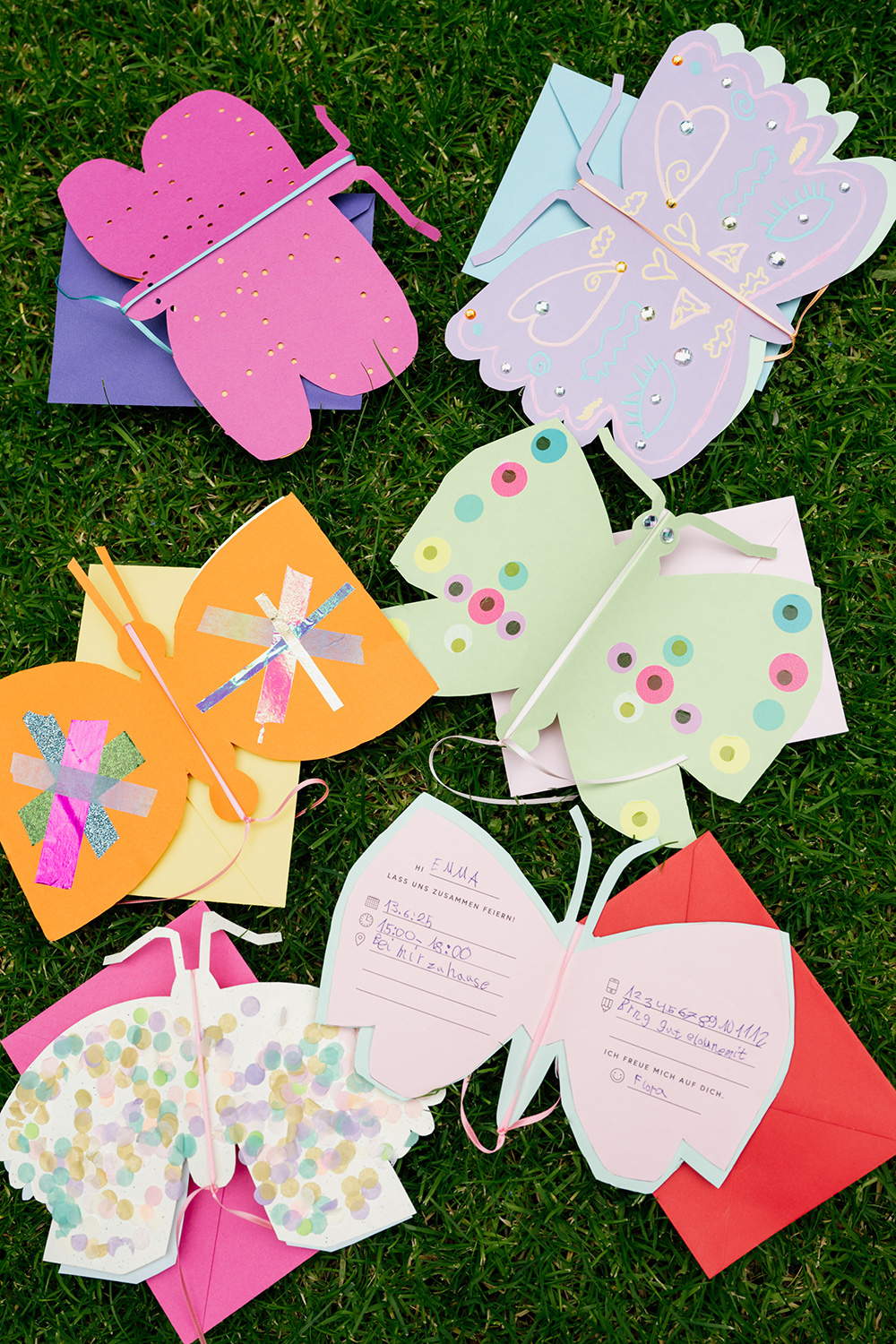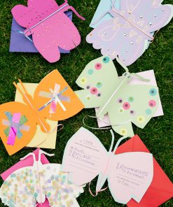 Dank des Vorlagensets ist das Basteln ein Kinderspiel – aus einfachen Klappkarten oder buntem Bastelpapier werden ruckzuck prächtige Schmetterlinge, die nach Lust und Laune mutig verziert werden. So sieht jede Einladung einzigartig aus. Lieben wir!