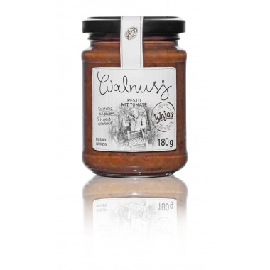 Wenn Walnuss und Tomate sich küssen, dann entsteht eine einzigartige Komposition: das Wajos Walnuss Pesto mit Tomate! Das nussige Aroma ausgewählter Walnüsse, kombiniert mit der feinen Fruchtigkeit sonnengereifter Tomaten, macht ein simples Abendbrot zum wahren Genusserlebnis, verwandelt eine einfache Pasta zu einer Delikatesse und macht aus faden Saucen aufregende Würzungen.