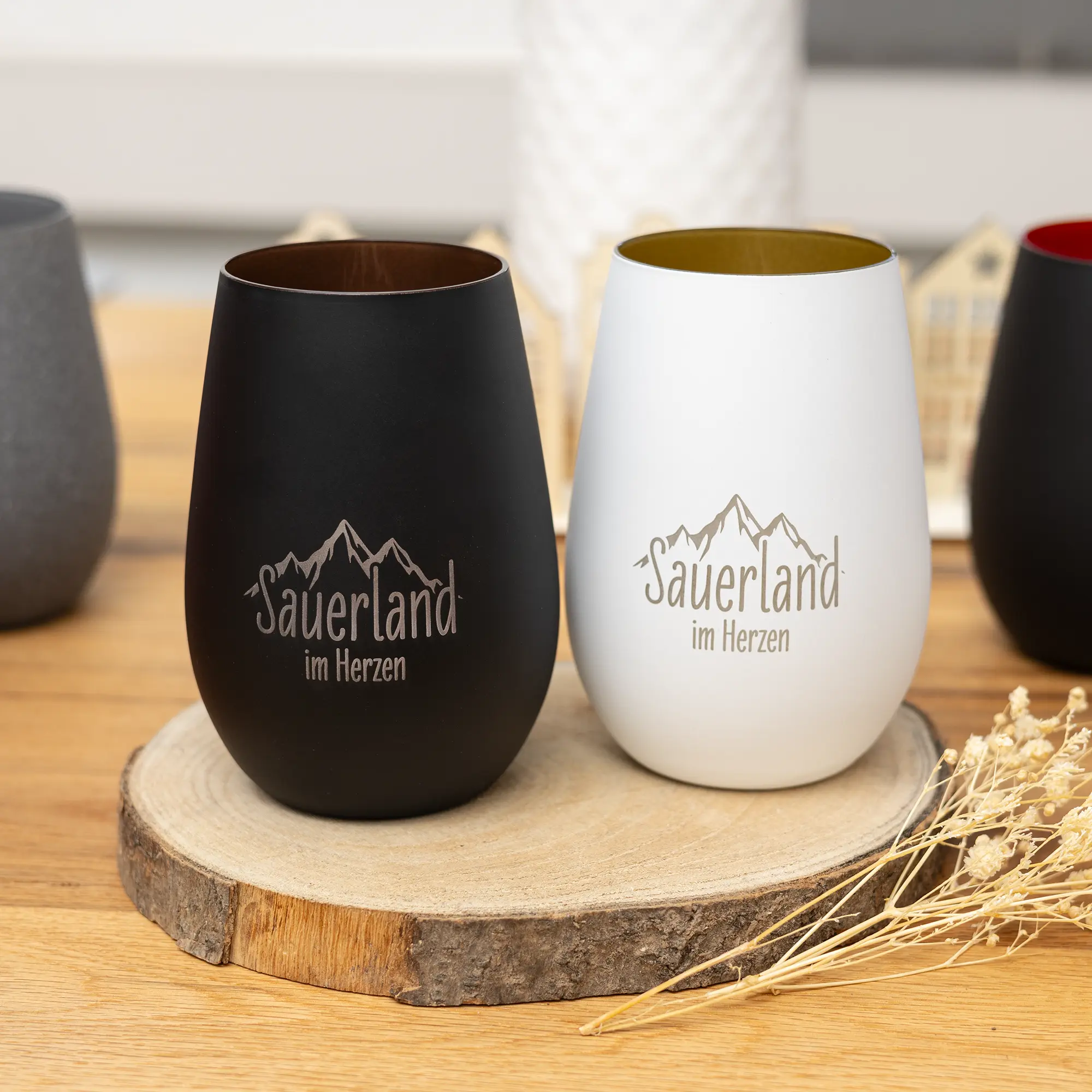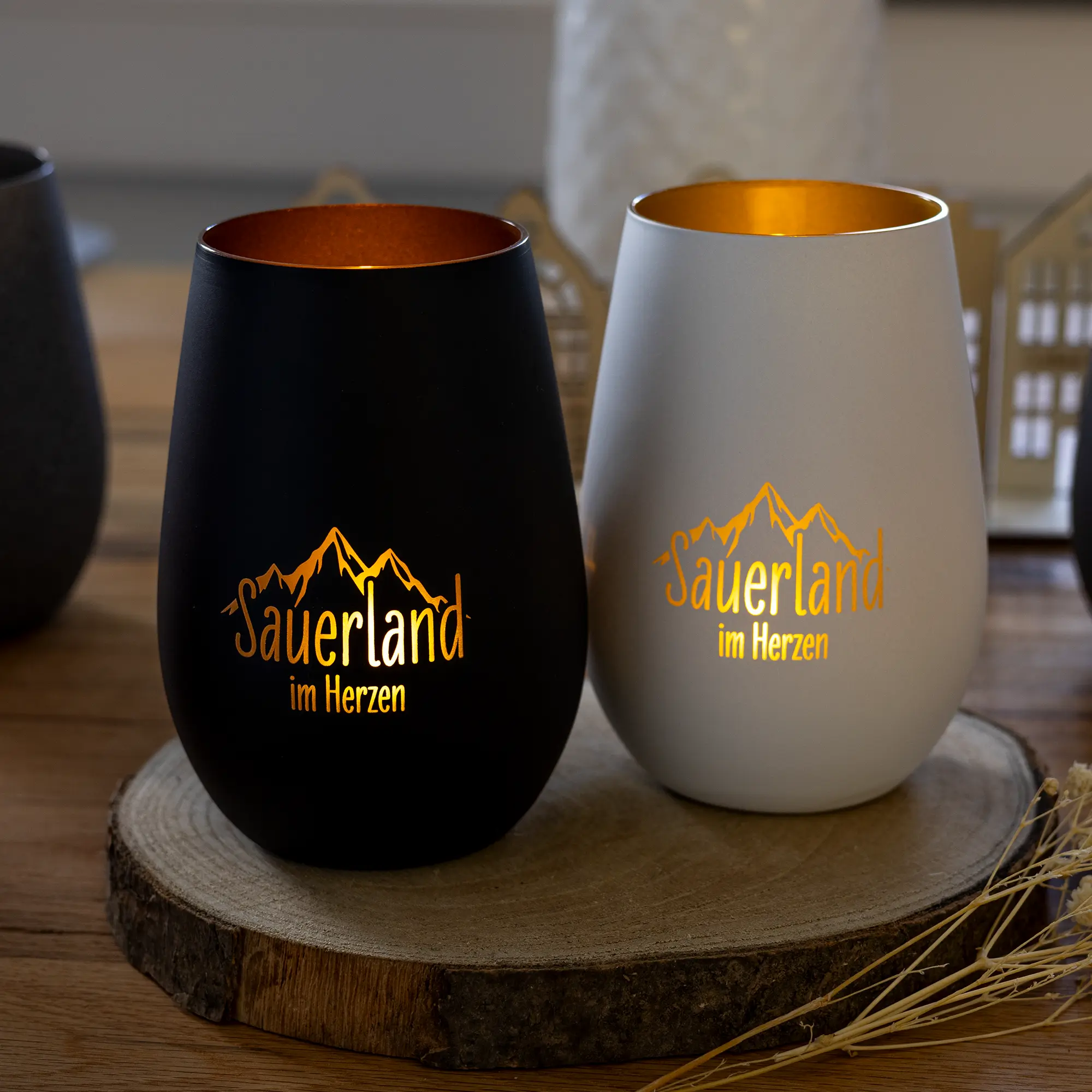 Das Sauerland im Herzen und auch bei euch zu Hause mit unserem Windlicht mit dem schönen Motiv „Sauerland im Herzen“. Mit dem Windlicht, welches mit einer feinen und präzisen Lasergravur versehen ist, erhaltet ihr ein wunderschönes Windlicht, welches ihr nach Belieben überall aufstellen könnt, um eure Wohnung oder andere Bereiche zu dekorieren und mit einem schönen Motiv zu beleuchten. Durch das hochwertige Glas könnt ihr die Windlichter nicht nur im Innen-, sondern auch problemlos im Außenbereich aufstellen. Das Glas ist außen und innen unterschiedlich gefärbt, wodurch euch verschiedenste Farbkombinationen zur Verfügung stehen, welche ihr ganz nach eurem persönlichen Geschmack auswählen könnt. Des Weiteren ist es auch das perfekte Geschenk für eure Freunde oder die Familie, welche im Sauerland leben oder für alle, die das Sauerland wortwörtlich im Herzen haben.